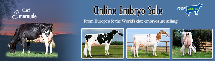 13. Februar 2026 A new edition of the Eurogenes Online Embryo Sale is OPEN for BIDDING. Log-in and take a view in the exciting offering with embryos from the hottest sires and greatest families right now! Selling are Female Mountie-Red (+3008 GTPI / +2.53 PTAT) embryos from Golden-Oaks Ambrosia-Red VG-89-NL EX-91-MS 4yr., she is an Altitude-Red granddaughter to Miss Pottsdale Tang-Red EX-94-USA, Eskdale Powerstar *RC (+3128 GTPI / +3.04 PTAT / +9 Conf.) embryos from a Bullseye daughter going back on the proven breeding cow Carf Emeraude EX-91-NL, Female Stantons Chief embryos from the VG-86 2yr. old Haniko daughter Bibian and multiple herdbuilding packages starting at 75 EUR / embryo. Continue reading.. Mehr lesen