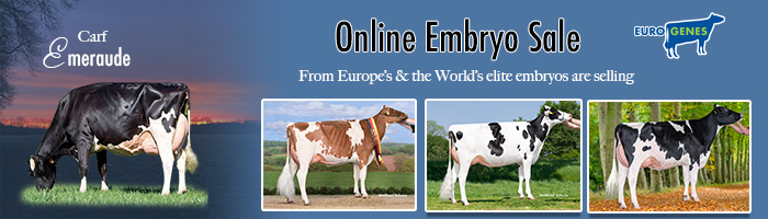 9 janvier 2026 A brand new and first edition of 2026 of the Eurogenes Online Embryo Sale just started. Many interesting embryo packages are added to the sale with for example Female Mountie-Red (+3008 GTPI / +2.53 PTAT) embryos from MS Latenite Sugar Mummy P Red are selling. She is a polled and R&W Latenite P granddaughter to Blondin Redman Seisme EX-97, the 3x Grand Champion World Dairy Expo. Or Female Haveitall Blakely Hinge (+3242 GTPI / +2.80 PTAT) embryos from Sunibelle Dempsey Esprit EX-96-CH her Arrow granddaughter could be yours! Esprit EX-96 has an amazing victory list with winning for example Senior Champion and Grand Champion Swiss Expo 2024. Bid last on Aurora Howland P (+3348 GTPI / +1.56 PTAT) embryos from Broeklander HiPo H Liza, a Harold P daughter at +3143 GTPI and more 'herdbuilding' packages. Continue reading.. En Lire Plus