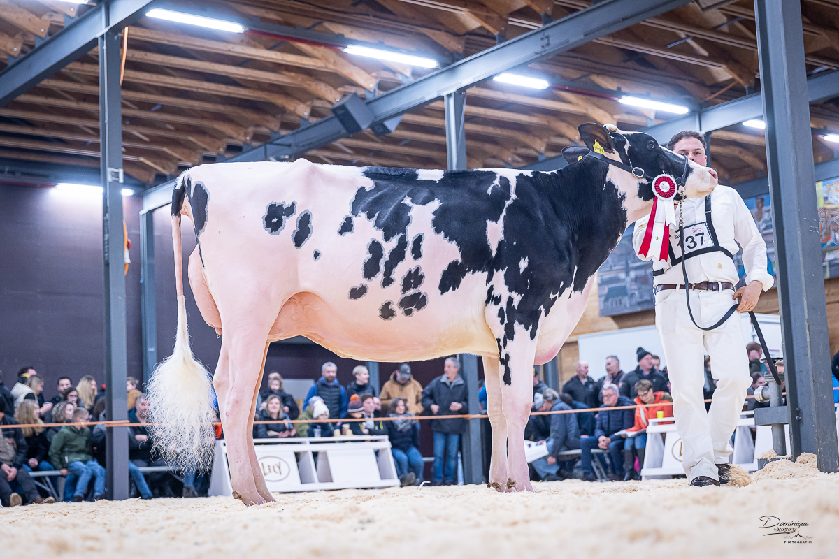 Take a moment for this exciting picture of the Junior Champion Expo Gruyère 2026, Kolly-JL Arrow Nuance! She won last weekend her class at the Expo Gruyère 2026 and is crowned as Junior Champion by judge Julien Pichonnat. This 2yr. old NH DG Arrow daughter from a EX-90 Calvados dam is owned by Ferme Kolly-JL & Richard Gaëten, Switzerland and classified with VG-87-CH 2yr. with VG-87 for her Mammary System! The daughter proven type sensation: NH DG Arrow, is a King Doc son from Al-Lew Monterey Ashley EX-95-USA and has already a lot of beautiful and showwinning daughters worldwide! Arrow is bred by Diamond Genetics & Nosbisch Holsteins and sold to AI-Total. With 3770 daughters in his US-index at 1151 herds, he shows us +2720 GTPI with +2.19 PTAT and +1.54 UDC! Furthermore he has +0.02% Fat and +0.03% Protein in his index with +2.04 Stature, +1.41 Strength, Sloped and Wide Rumps, +2.20 Fore Udder Attachment, +1.89 Rear Udder Height and +1.70 Rear Udder Width!