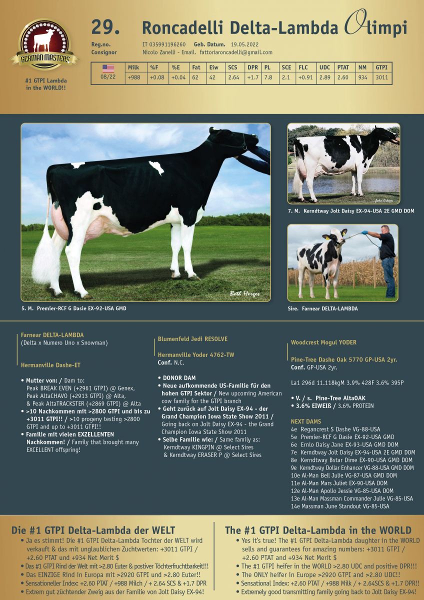 Roncadelli Delta-Lambda Olimpi reaches the SKY!! This Farnear Delta-Lambda daughter scores +3011 GTPI in her US index in combination with +2.60 PTAT and >2.80 UDC, that makes her the #1 GTPI Delta-Lambda heifer in EUROPE! Furthermore she has in her US-index: +988kgM with positive components, +1.7 DPR and +934 NM$. Her dam is Hermanville Dashe, she is a Resolve daughter and dam to Peak Break Even (+2961 GTPI) @ Genex, Peak AltaChavo (+2913 GTPI) @Alta and Peak AltaTrackster @Alta. She is out of Hermanville Yoder 4762-TW, she is a Yoder daughter from a new upcoming American cow family for the GTPI branch and is going back on Jolt Daisy EX-94-USA, she was Grand Champion Iowa State Show 2011. Olimpi will be sold this friday at the German Masters Sale 2022 in absentee!