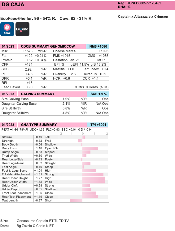 Captain daughter DG Ceylin is the name who writes history! She is the #1 GTPI heifer in Europe at +3197 GTPI and the #1 heifer in the WORLD combining +3197 GTPI with +1.97 PTAT!! Her full sisters already came back last week with a US index: DG Ceyda scores +3095 GTPI and +1179 NM$ (#5 NM$ in Europe) and DG Caja scores +3091 GTPI with +1086 NM$ and +1.64 PTAT! These 3 very promising Captain daughters are out of the topranking AltaZazzle daughter: BG Zazzle C Carlin K, owned by Diamond Genetics and Cogent (UK), they have as 4th dam Glamour Carlin EX-92-UK 38* and are tracing back to Larcrest Cosmopolitan VG-87-USA GMD DOM. Back to the Captain daughters, DG Ceyda (A2A2) offers an unique profile with +1936kgM with +213 combined Fat + Protein, 1.4% SCE and +1,28 UDC. DG Caja (A2A2) has also a great profile with +1578 kgM with +184 combined Fat + Protein, a positive DPR, 1.9% SCE, sloped & wide rumps and a correct set of legs with +1.35 UDC!