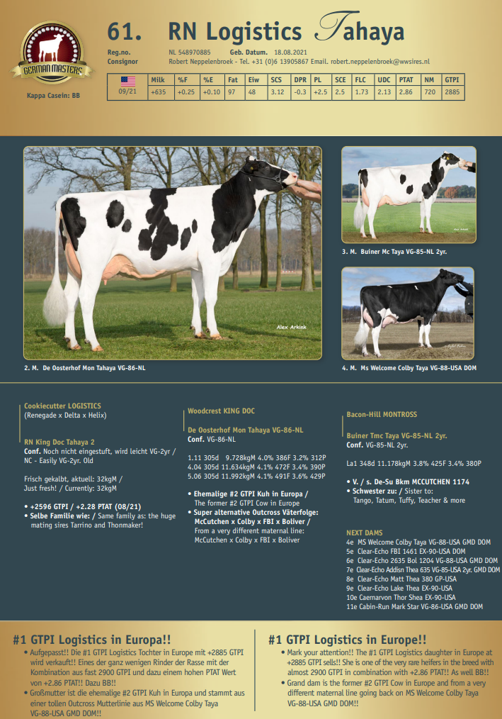 Lot 61. in the German Masters Sale 2021 October the 22nd, is RN Logistics Tahaya a young Logistics daughter out of King Doc daughter RN King Doc Tahaya 2. King Doc Tahaya 2 (+2596 GTPI / +2.28 PTAT) is just fresh and produces currently 32kg Milk. RN Logistics Tayaha is the #1 GTPI Logistics with +2885 GTPI in combination with +2.86 PTAT! Grand dam, De Oosterhof Mon Tahaya VG-86-NL, is the former #2 GTPI Cow in Europe and is going back on MS Welcome Colby Taya VG-88-USA GMD DOM! RN Logistics Tahaya will be sold during the German Masters Sale in absentee.