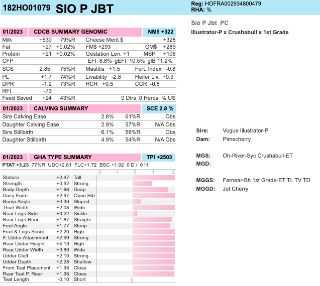 The newest Eurogenes member GAEC Toullec in France have bred the #1 PTAT POLLED Illustrator P sire in Europe! His name is Sio P JBT @Genes Diffusion and is an Illustator P son at +3.23 PTAT and +2503 GTPI! He scores in his Canadian index +11 Conformation with +10 for Mammary System! His dam is a Crushabull daughter Pimecherry VG-87-FR 2yr. out of a 1st Grade daughter. 4th dam of Sio P JBT is JB Toullec Hot Cherry EX-90-FR with EX-92 for her Mammary System. She is dam to Disanto (s. Doorman) @VOST out of JB Toullec Cherrygirl VG-88-FR VG-89-MS, she is the dam to Hollywood (s. Dempsey) @Ascol. Another great family member is JB Toullec Raniko VG-85-FR VG-86-MS 2yr., she is a Haniko daughter at +3.89 PTAT and +8 Conformation. This family is from a deep French cow family with 13 generation VG- or Excellent cows and from the same family as the great broodcow: Carf Emeraude EX-90-DE.