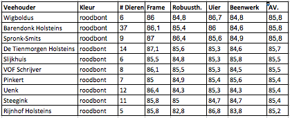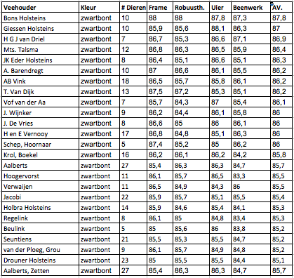 The 2014 classification statistics of classified 1st calvers from the Netherlands has been published. Bons Holsteins has the highest average classification score with the B&W animals with 10 2yr. olds classified with an average score of VG-87,8! Several Eurogenes members are in the Top ranking of 2014 like Giessen Holsteins, Rijnhof Holsteins, JK Eder, Holbra Holsteins and Drouner Holsteins.