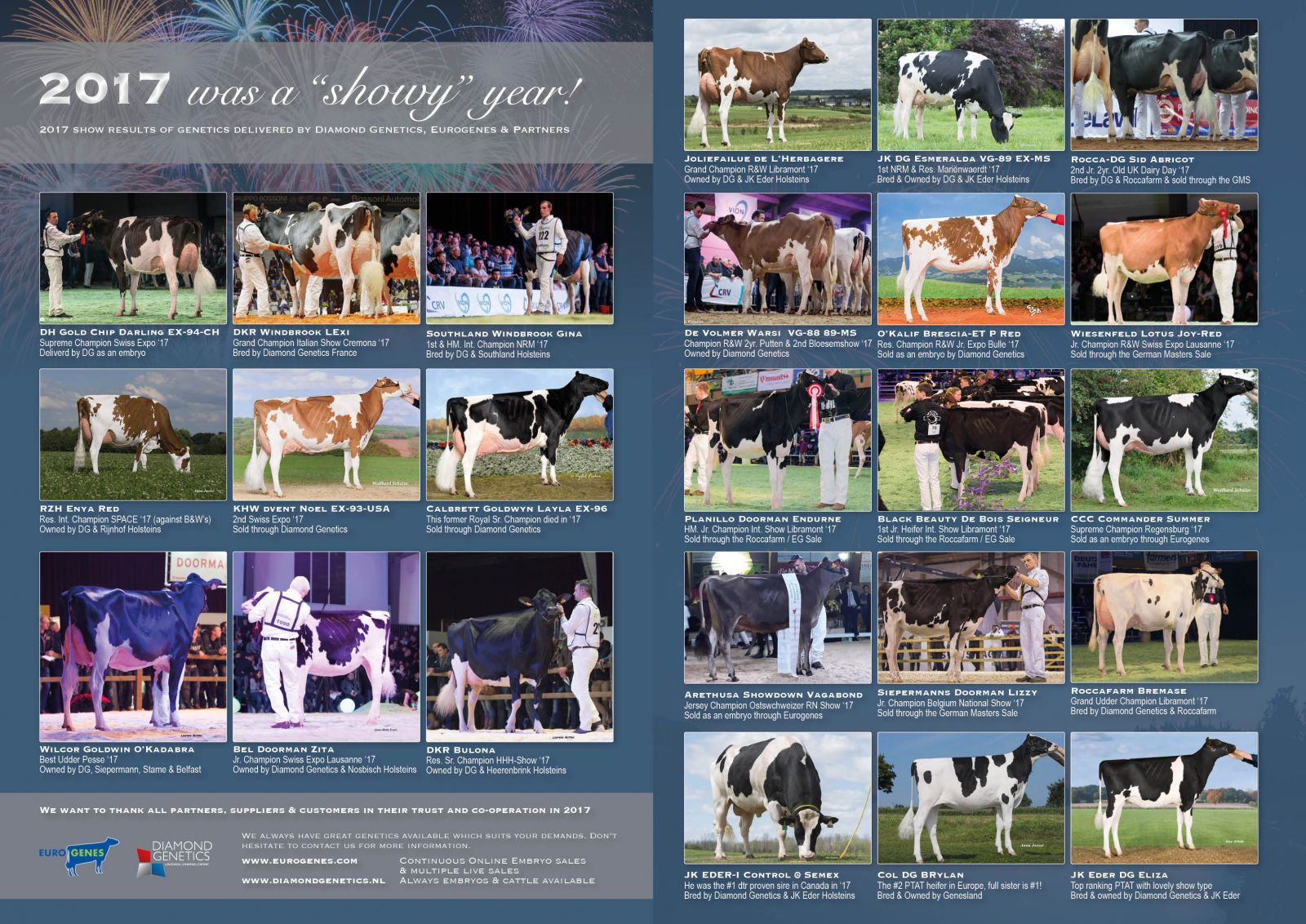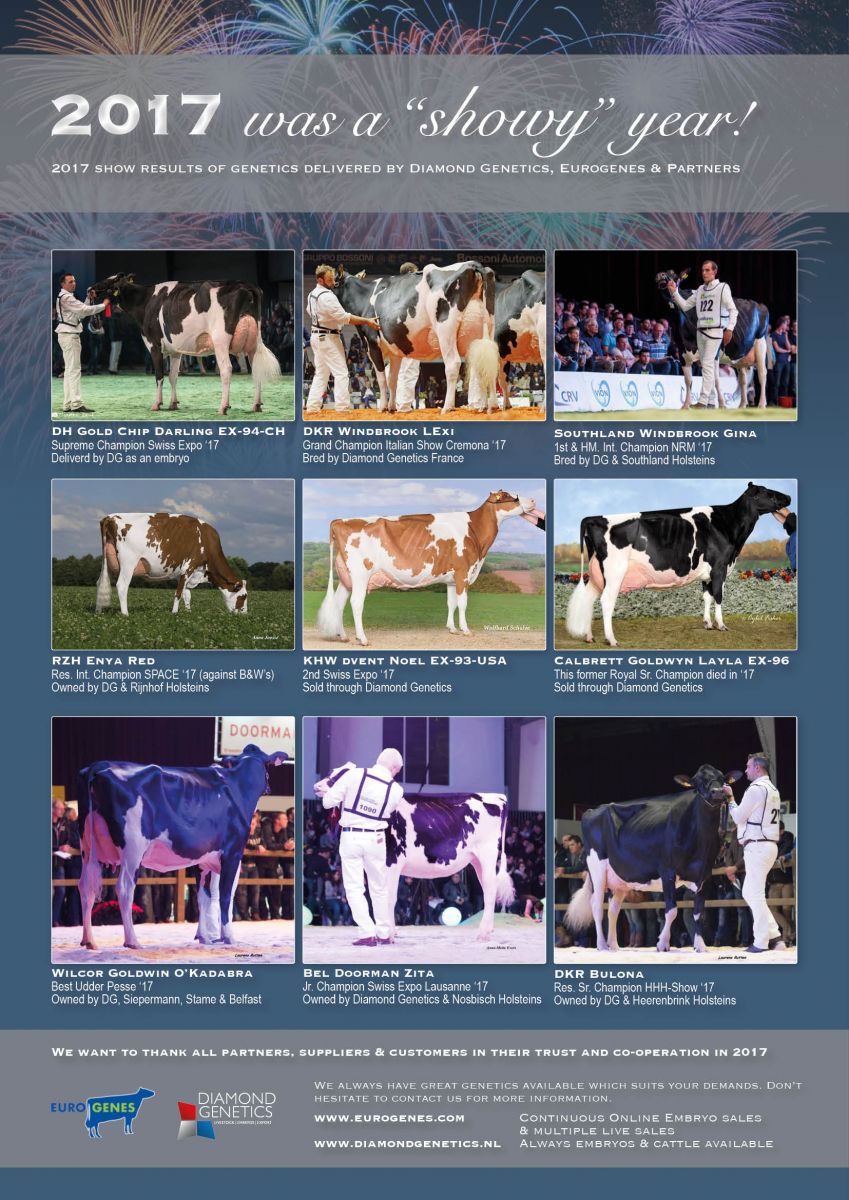 2017 was a great SHOW year for the genetics delivered by Diamond Genetics & Eurogenes & Partners! Click further for the examples of show results of genetics delivered. We want to thank all suppliers, partners & customers for their trust & co-operation in 2017! We look forward for a great 2018! Keep an eye on our website for the upcoming Online Embryo Sales and upcoming live sale dates for 2018 in which we will sell the next great opportunities for your next show success!