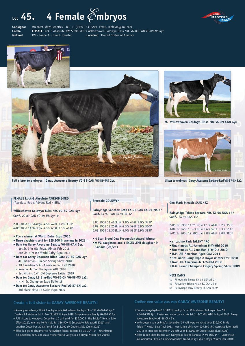 An exciting additonal lot in the Online Holland Masters Sale! Four FEMALE embryos are selling by Luck-E AWESOME-RED from Willowhaven Goldwyn Bliss *RC VG-89-CAN 4yr. 3*. The dam to: Garay Awesome Beauty VG-88-CAN VG-89-MS 2yr. - 2nd Jr. 2-Yr Old World Dairy Expo 2018 & 1st Jr. 2-Yr Old Royal Winter Fair 2018!! Three daughters of donor Bliss sold in 2021: December ‘20 calf sold for $36,000 in the Triple-T Health Sale (May 2021), Yearling heifer sold for $26,500 @ Interstate Sale (April 2021) and another December ‘20 calf sold for $15,000 @ Duckett Sale (June 2021). Bliss is a grand daughter to Rainyridge Talent Barbara EX-95-USA 14* - Unanimous All-American 2020 and class winner World Dairy Expo & Royal Winter Fair 2010!!