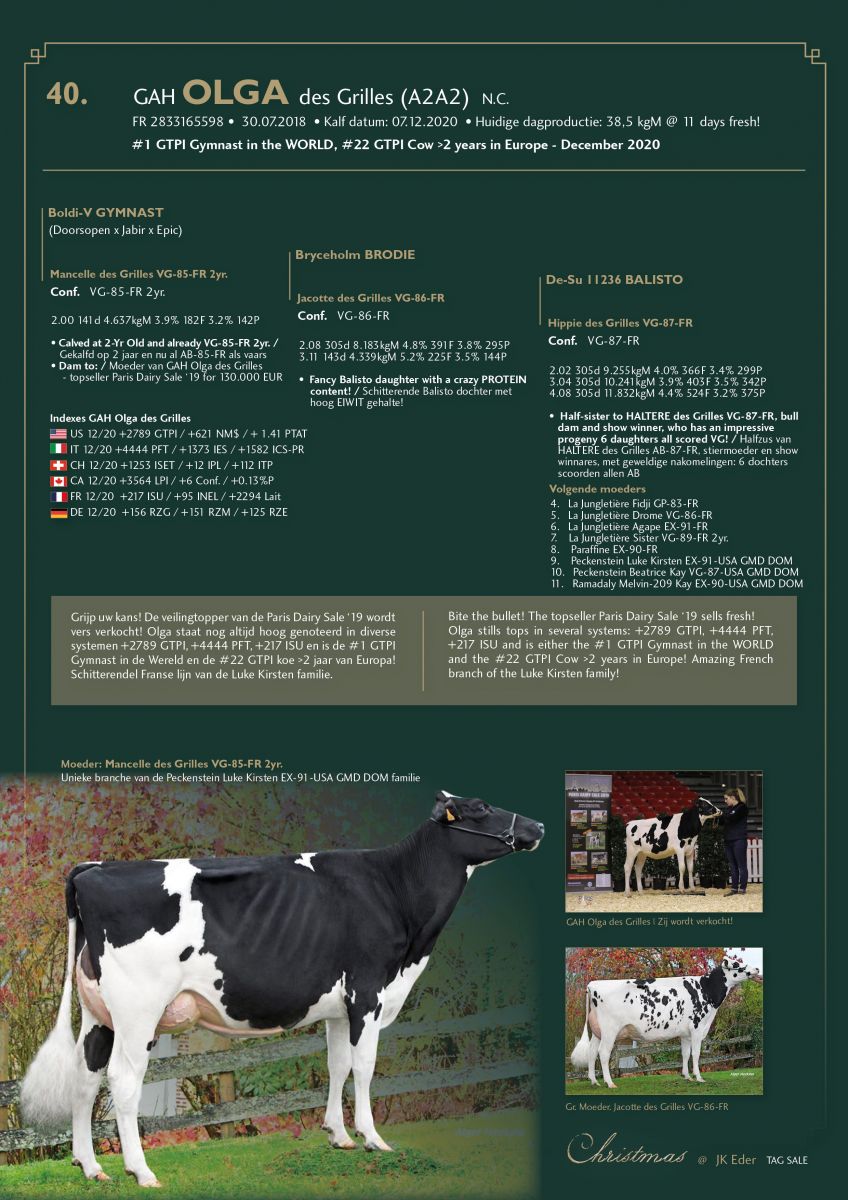 An exciting additional lot in the CHRISTMAS @ JK Eder TAG+ Sale! Bite the bullet! The topseller Paris Dairy Sale '19: GAH Olga des Grilles sells fresh @ 11 days in milk with currently 38,5kgM / day! Olga still tops in several systems: +2789 GTPI, +444 PFT, +217 ISU and is either the #1 GTPI Gymnast in the WORLD and the #22 GTPI Cow >2 years in Europe! Amazing French branch of the Luke Kirsten family! Click further to find out more.