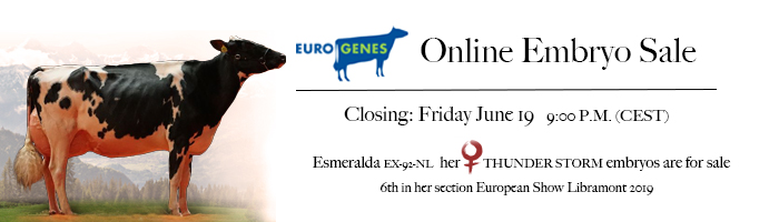 Two exciting additional lots in the Eurogenes Online Embryo Sale - Start of Summer Edition. First are FEMALE Avatar-Red embryos selling from a fancy Crush (not available Europe) heifer x VG-87-USA Archrival (either not available in Europe) x Jacobs Goldwyn Britany EX-96-CAN - Res. All-Canadian 2011. This heifer's dam is a maternal sister to Jacobs Sid Beauty EX-95-USA who won Int. Champion World Dairy Expo 2015 & Jacobs Solomon Bridal VG-87-CAN 2yr. - 1st Jr. 2-Yr Old World Dairy Expo 2019. Furthermore are five FEMALE Upgrade (3.49 PTAT) embryos selling from Jacobs Valerie. This potential RED CARRIER sired by Apple Crisp *RC is a directly daughter of Jacbos Atwood Vedette EX-95-CAN 2E. Vedette was Res. Int. Champion World Dairy Expo 2014, H.M. Grand Champion Montmagny 2015, 1st 4-Yr Old Trois-Rivières 2015 and is from the same family as Jacobs Goldwyn Valana EX-95-USA - Res. Grand Champion WDE 2015.