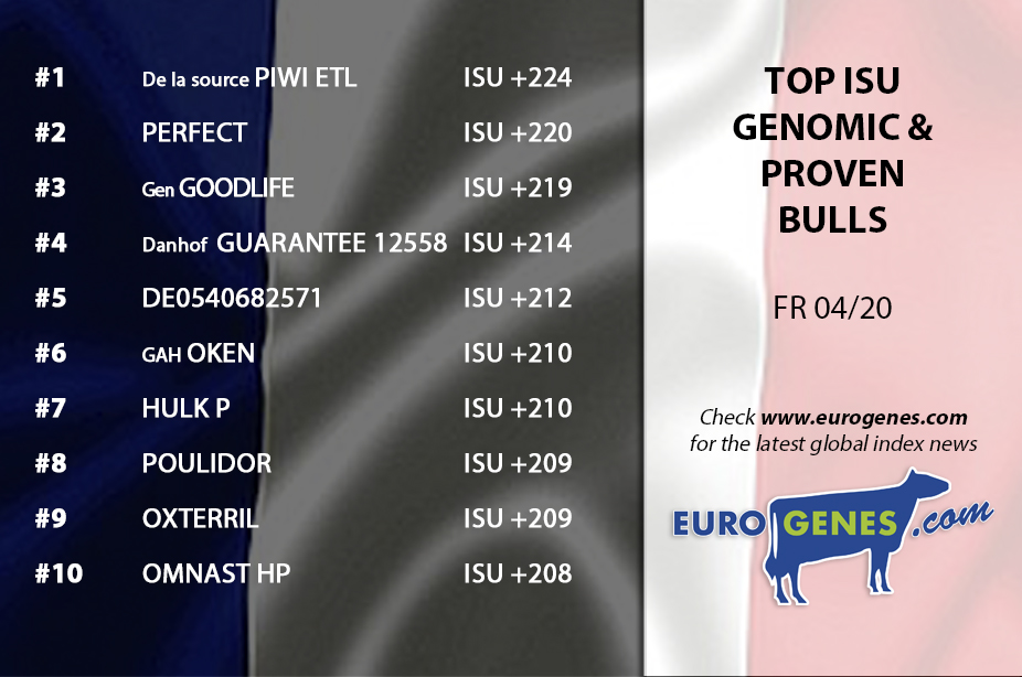 De la source PIWI ETL takes charge in the French system at +224 ISU. In second follows PERFECT with +220 ISU. The former chart topper Gen Goodlife drops two spots to the third place at +219 ISU. Futhermore we find at place four Danhof Guarantee at +214 ISU. Click further for the complete new French bull indexes of April 2020.