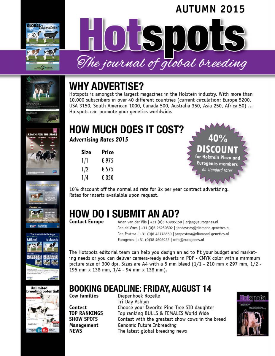 The Hotspots is one of the largest magazines in the Holstein industry wtih >10.000 subscribers out of more than 40 different countries. 3 times per year the readers can ejoy great cow family articles, the global top rankings for males and females, the lateset global breeding news and more! As well it's a fantastic way to advertise your company or genetics to this industry, you can already advertise for EUR 210 (for Eurogenes members) to a huge reach of potential clients! Read more information about the Autumn 2015 edition here and reserve your advert now!