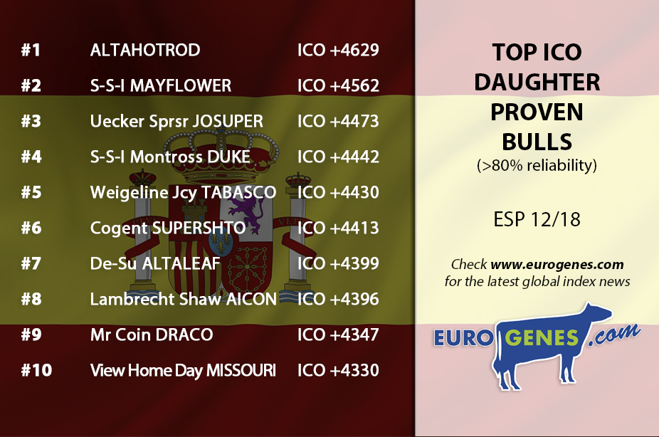 The charttopper in the daughter proven list in Spain is Glen-D-Haven Altahotrod with +4629 ICO. With 67 points less follows S-S-I Snowman Mayflower with +4562 ICO at place 2. Uecker Supersire Josuper is the third in the daughter proven list with +4473 ICO. S-S-I Montross Duke follows at place 4 with +4442 ICO and Weigeline Jacey Tabasco at place 5 with +4430 ICO. Striking is that all the bulls in the top 5 are from American origin! In this daughter proven list with at least 80% reliability is Cogent Supershot taking the 6th place with +4413 ICO. He is bred by De Volmer Holsteins & Diamond Genetics and available through KI-Samen.