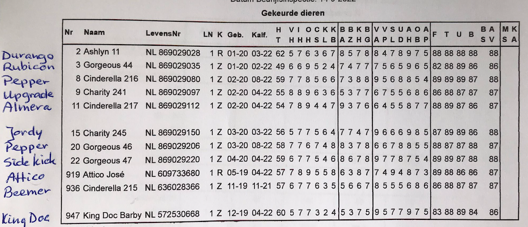 Last week the classifier visit Giessen Holsteins, Theo van Vliet, and scored many impressive 2yr. olds which resulted in an average of VG-87,1 at the 2yr. old black & whites and VG-87,5 at the 2yr. old red & whites. These 2yr. olds are sired by: Durango, Rubicon, Pepper, Upgrade, Jordy-Red, Sidekick, Beemer and King Doc. With this new scored 2yr. olds the herd average is now VG-87,8 which makes Giessen Holsteins belong to the top of the stage in the Netherlands. All 2yr olds were backed by the famous Cinderella's, Charity's, Gorgeous', Barbies, Ashlyn's and Joses!