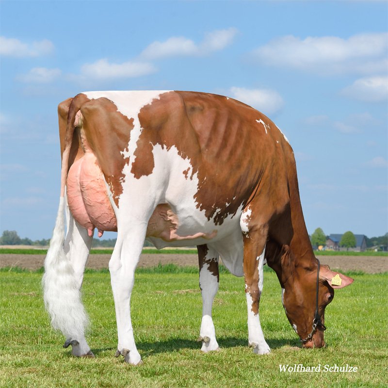 NH Solito-Red, he is one of the R&W RZG / RZE sensations and ranks high in the German Index with +151 gRZG and +129 RZE (type). He is an Salvatore *RC son out of R DG Alyssa-Red VG-85-DE VG-87-MS 2yr. She is a stunning Atwork *RC daughter from one of the greatest transmitting lines of the KHW Goldwyn Aiko *RC EX-91-USA DOM cow family: BTS-Avea Red VG-87-NL VG-89-MS 2yr. (s. Detox). Avea-Red was 1st in her class at the Summershow Beilen and Reserve Champion 2yr. old Summershow Opmeer between the Black & Whites. Avea is also dam to the sires: Aviator-Red, Alphaman & Adam-Red and has multiple amazing daughters! Back to NH Solito-Red, his first daughter, Baarlinger Red Rose is pictured and successfull classified with VG-88-NL 2yr. old with VG-89 for her amazing Mamarry System.