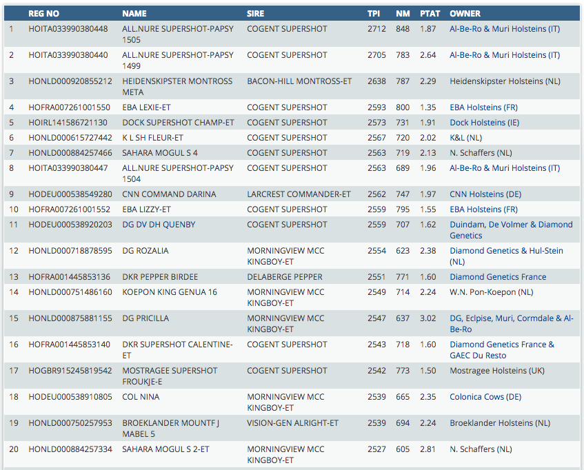 The American intermediate run of May 2015 took place yesterday, the #1 and #2 heifer in the European run are the full sisters All.Nure Supershot Papsy 1505 and Papsy 1499, both out of a Numero Uno daughter of the former #1 GTPI cow Muri Planet Popsy VG-87-IT 2yr. They are testing GTPI +2712 and GTPI +2705! The highest PTAT animal this run was Flora Atwood Adeena VG-87-ES 2yr., the full sister of Eclipse Atwood Archrival, the #1 PTAT bull in the breed and out of the great MS Kingstead Chief Adeen cow family! Click further for the topranking GTPI and PTAT lists of the May run.