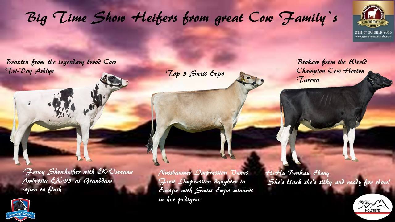 The very best out of Austria sells in the German Masters Sale! A Top 5 Swiss Expo Jersey, a grand dtr of EK-Oseeana Ambrosia EX-95 and a Brokaw going back on the former World Champion Horton Tarona EX-96-DE, these heifers are offered by Eurogenes member Schoenhof Holsteins, M. Hirshhuber and A. Bärnthaler. Click further for more information.