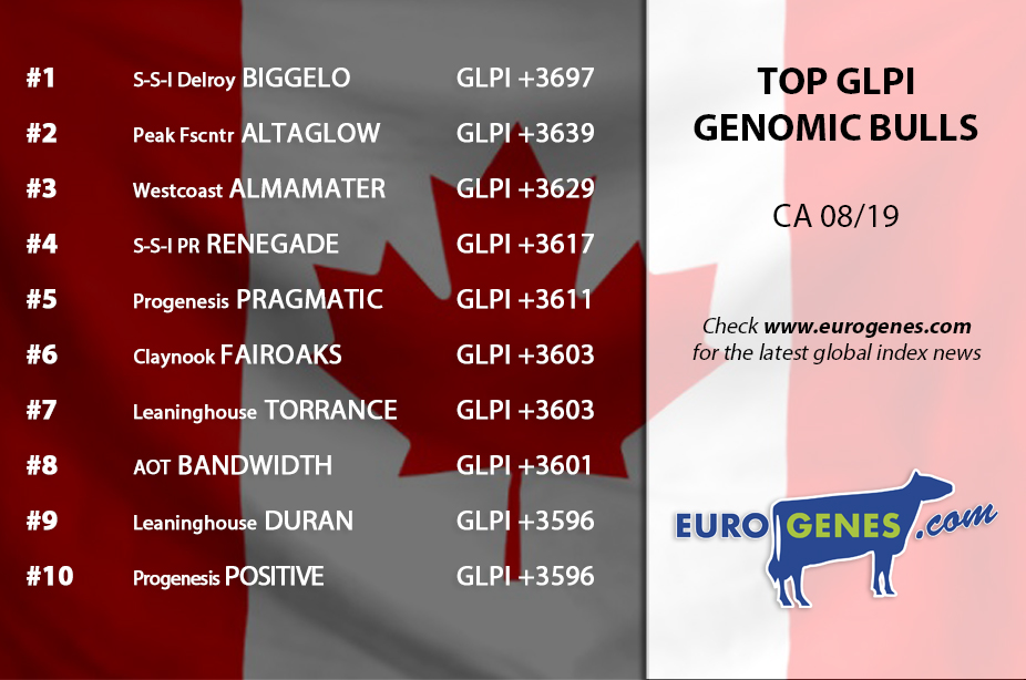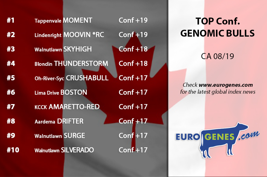 He is this run again the #1 LPI bull in Canada: S-S-I Delroy BIGGELO, this outstanding number 1 notes +3697 LPI. 58 points above the number 2 in the Genomic bulls list: Peak Fscntr ALTAGLOW with +3639 LPI. Furthermore we find the former #3 S-S-I Pr Renegade at place 4 with +3617 LPI. The domestic daughter proven LPI list is lead by Benner Bardo with +3491 LPI closely followed by Silverstream Porter with +3471 LPI. The top Conformation bulls this August '19 run are Tappenvale Moment & the RED CARRIER Lindenright Moovin *RC with both +19 Conformation. The former #1 TYPE bull Walnutlawn Skyhigh, we find now at place 3 with +18 Conf. Also Col DG Crushtime possess the 5th place with again +17 for Conformation.