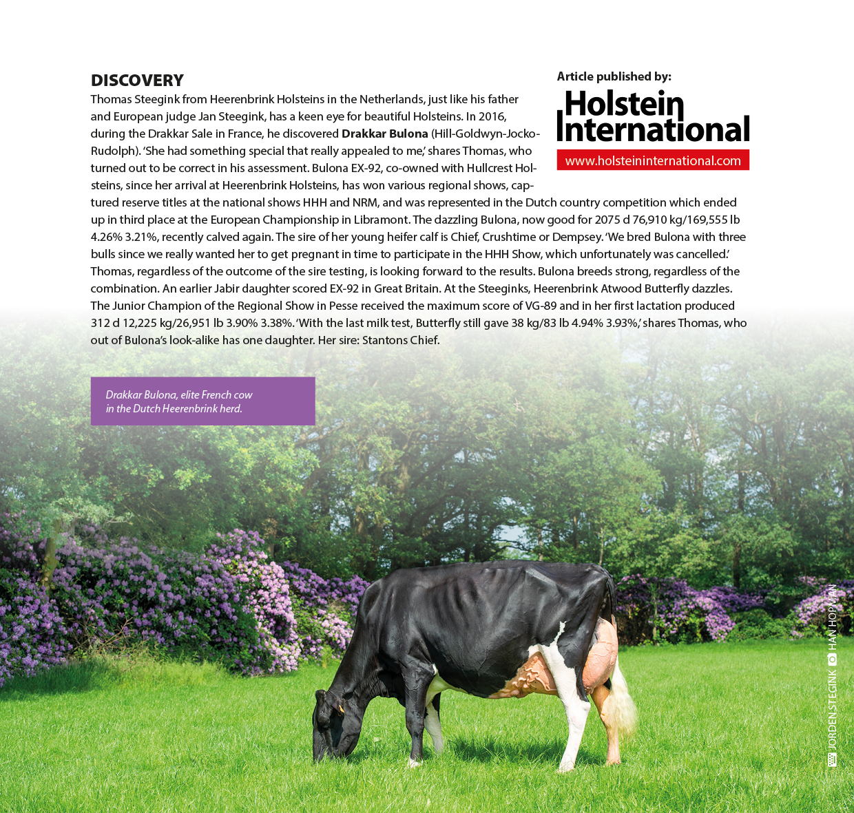 Drakkar Bulona EX-92-NL EX-93-MS was one of the eyecatches at the Vente Drakkar 2016. She sold to Heerenbrink Holsteins & Diamond Genetics and later on to Hullcrest Holsteins. Bulona won various regional shows, captured reserve titles at the national shows HHH-Show & NRM-Show, and was presented at the European Show in Libramont 2019. She turned out to be a huge transmitter as well with an EX-92 Jabir daughter in the UK and at Heerenbrink Holsteins a VG-89-NL 2yr. MAX-scored Atwood daughter which claimed the 2-Yr Old Champion ribbons at the Wintershow Pesse 2020. Holstein International has written a great article about Bulona in their December 2020 issue. Click further to read the full article.
