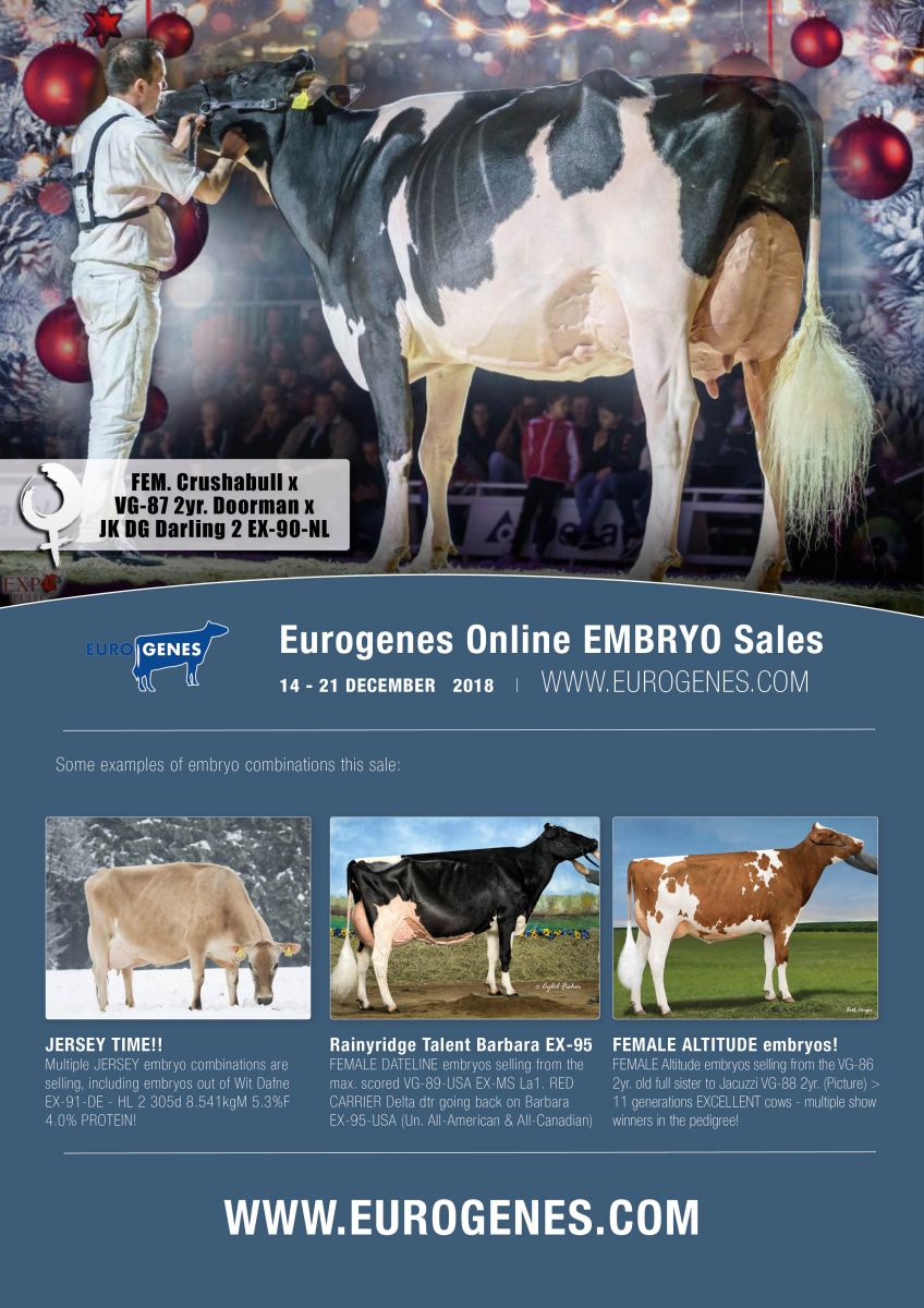 It's Christmas time! The Eurogenes Online Embryo Sale offers you the perfect way to buy your greatest Christmas gift! >30 embryo combinations are selling in all price ranges and from the greatest cow families in the World! Including FEMALE embryos from a VG-87 2yr. Doorman followed by the full sister to the Swiss Expo Supreme Champion '17 DH Gold Chip Darling EX-94-CH, JERSEY embryos, FEMALE ALTITUDE embryos, embryos from the VG-89 La1 Red Carrier Delta x Barbara EX-95 family and more! Click further for more examples.