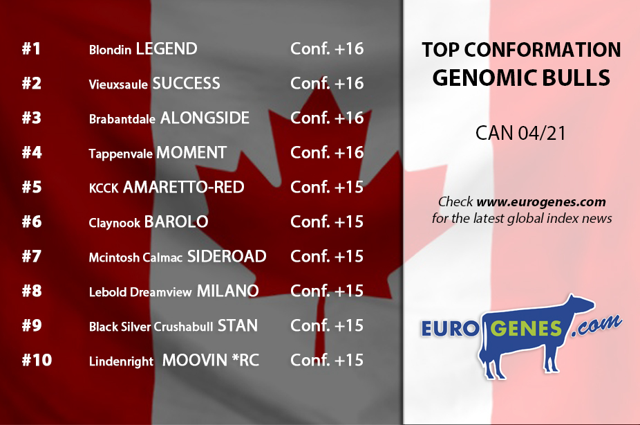 The new indexes from Canada came in! The #1 LPI sire is 3star OH Ranger-Red at +3910 PLI, followed by Sandy-Valley R Conway-ET at +3842 LPI. The #1 domestic proven bull is Westcoast Alcove with +3813 LPI in a great combination with +9 Conformation. The Type list is leading by Blondin Legend, Vieuxsaule Success, Brabantdale Alongside and Tappenvale Moment all at +16 Conformation! The #1 R&W Conformation sire is again KCCK AMARETTO-RED at +15 Conf. Click further for the complete Canadian rankings.