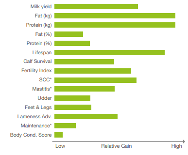 The English PLI formula strongly selects for smaller efficient cows with huge pounds fatt and protein with an extra bonus if it comes through the percentages and strong focus on major health traits. There is less focus on type including udders and feet & leggs. See below for extra information or click here