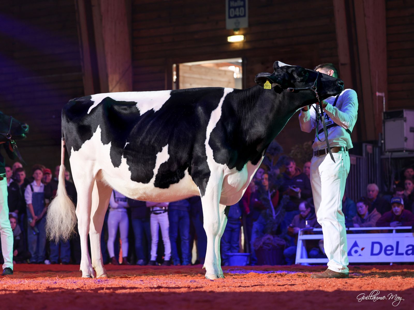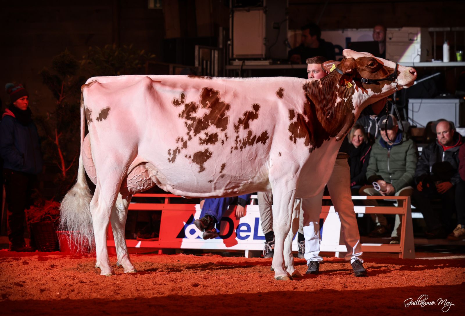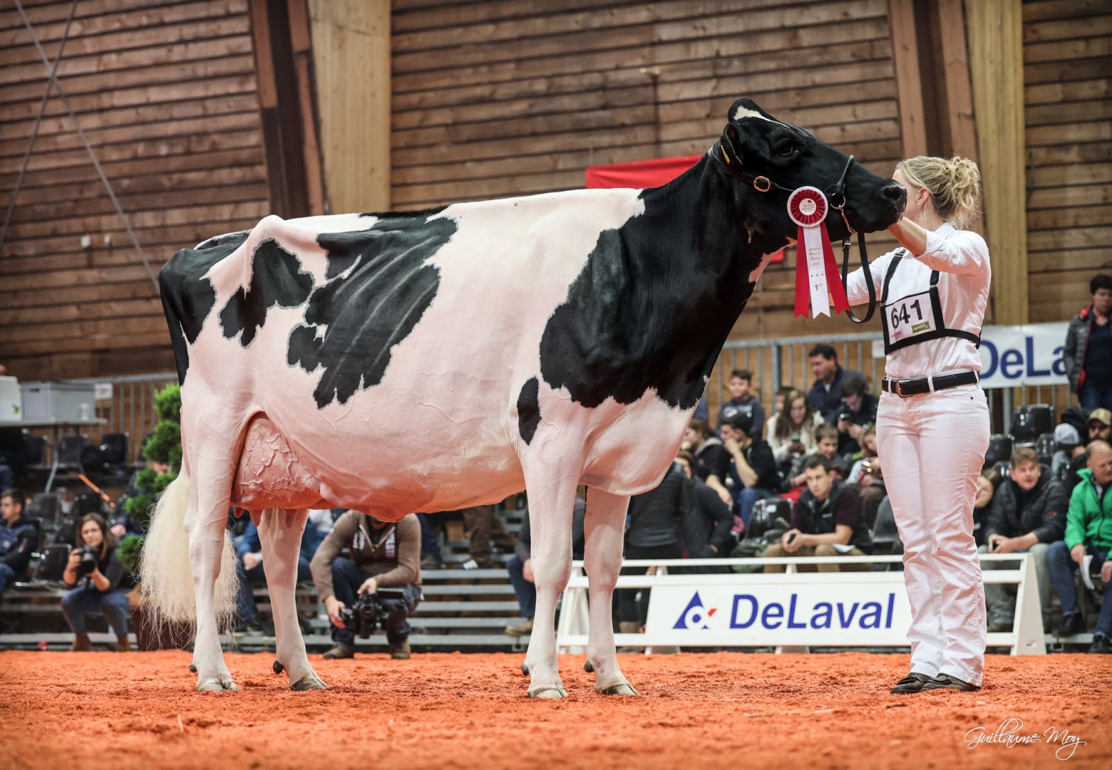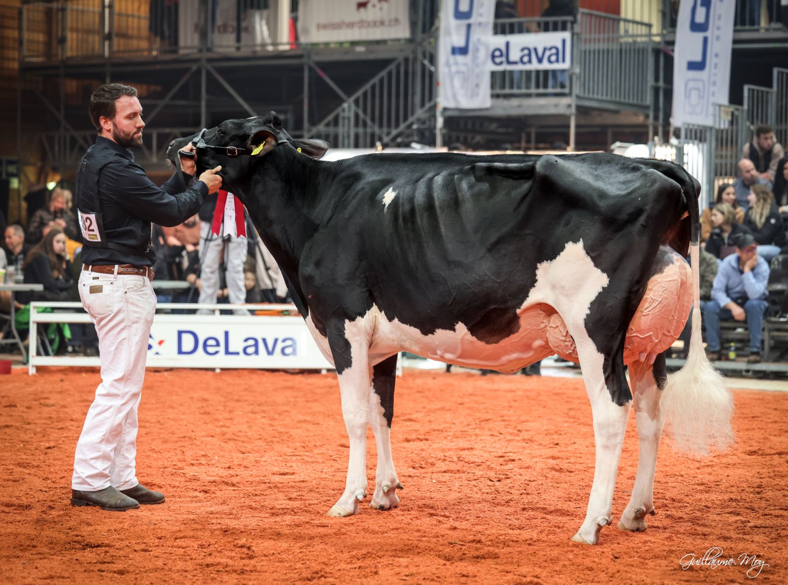 She is in topshape in her fourth lactation and added a new title on her victorylist last weekend at the Jr. Expo Bulle in Switzerland with winning the Senior Champion title and Grand Champion title B&W: Comestar Doorman O'Katrysha EX-93-CH EX-96-MS! The 6 yr. old Doorman granddaughter from Lovhill Goldwyn Katrysha EX-96-USA was followed by the Reserve Grand Champion Mollanges Gold Chip Fidela (s. Gold Chip). O'Kaliber daughter Goya became Honorable Mention Grand Champion B&W at the show. Supreme Champion of the show became Ptit Coeur Royalcrush Mauricette! All-Star Agent Elegance was classwinner and became later Senior Champion and Grand Champion R&W at the show. She was also in 2021 the R&W Grand Champion! She is followed by Mattenhof Armani Sayuri, she became Reserve Grand Champion. The Honorable Mention Grand Champion title was for Thomi's Power Flo-Red. Plattery Bad Ilona was named as Champion Heifers red&white, she is followed by the Altitude-red daughter from Strans-Jen-D Tequila-Red EX-96-USA: Milksource Altitude Tokyo.