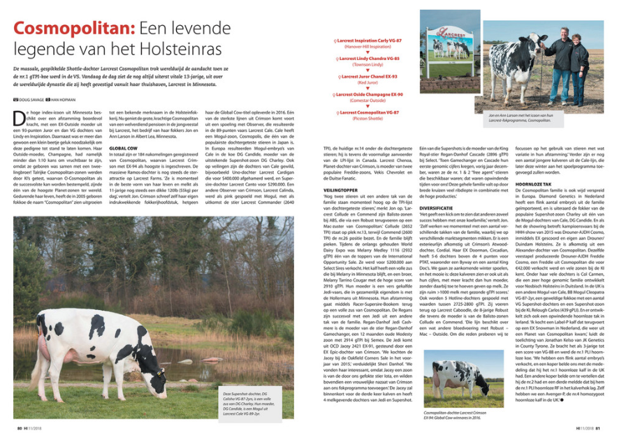 A truly legend in the Holstein breed is Larcrest Cosmpolitan VG-87-USA, a cow that build her own dynasty worldwide! Cosmopolitan got many interest from all over the world when came out that she was the #1 gTPI cow in the United States! This spotty capacitive Shottle daughter delivered over 180 offspring’s all over the world! The most famous is the highest classified Ramos daughter of Cosmopolitan: Larcrest Crimson EX-94-USA. She is the grand dam to Larcrest Commander @ ABS and still in production at Larcrest with currently 55kg Milk a day as an 11-year-old cow! Including these impressive parts made her the Global Cow of the Year 2016. One of the best lines out Crimson is the flush with Observer which brought Larcrest Cale VG-89-USA, she is the dam to Larcrest Cardigan (s. Uno) sold for $400,000 and Canto (s. Supersire) sold for $290,000!! This stunning Observer daughter also delivered the Mogul son Cosmopolis, one of the most popular daughter proven bulls in Japan. In Europa made her Mogul daughter DG Candide VG-85-NL many euphoria. She is the dam to the global sensation: DG Charley, he was the #1 gTPI bull in the World and is nowadays a great transmitter!