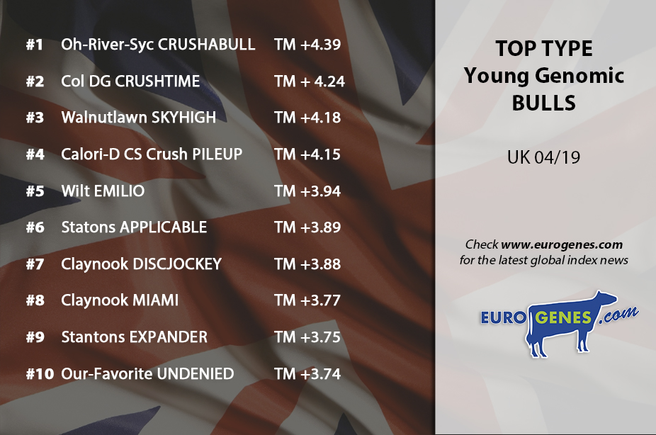 The second index run this day is from the United Kingdom! The #1 PLI genomic sire is Denovo Crosby with +863 PLI followed by Denovo Atrium with +861 PLI. Third in the international genomic list in te UK is De-Su Appeal with +856 PLI and +2.50 TM (Type). In the daughter proven list is Larcrest Commend still the chart topper in the list with +767 PLI. Second one is Cookiecutter Harper with +752 PLI in a great combination with +2.09 TM (Type). The two Crush sons Col DG Crushtime and Oh-River-Syc Crushabull are topping the Type list. Crushabull notes +4.39 TM followed by Crushtime with +4.24 TM. Crushtime is a Crush grandson from Oh-River-Syc Billie EX-91-USA 4yr. - who also is the full sister to Byway @ Semex. This family proved to make great ones and traces back to Regancrest-PR Barbie EX-92-USA.