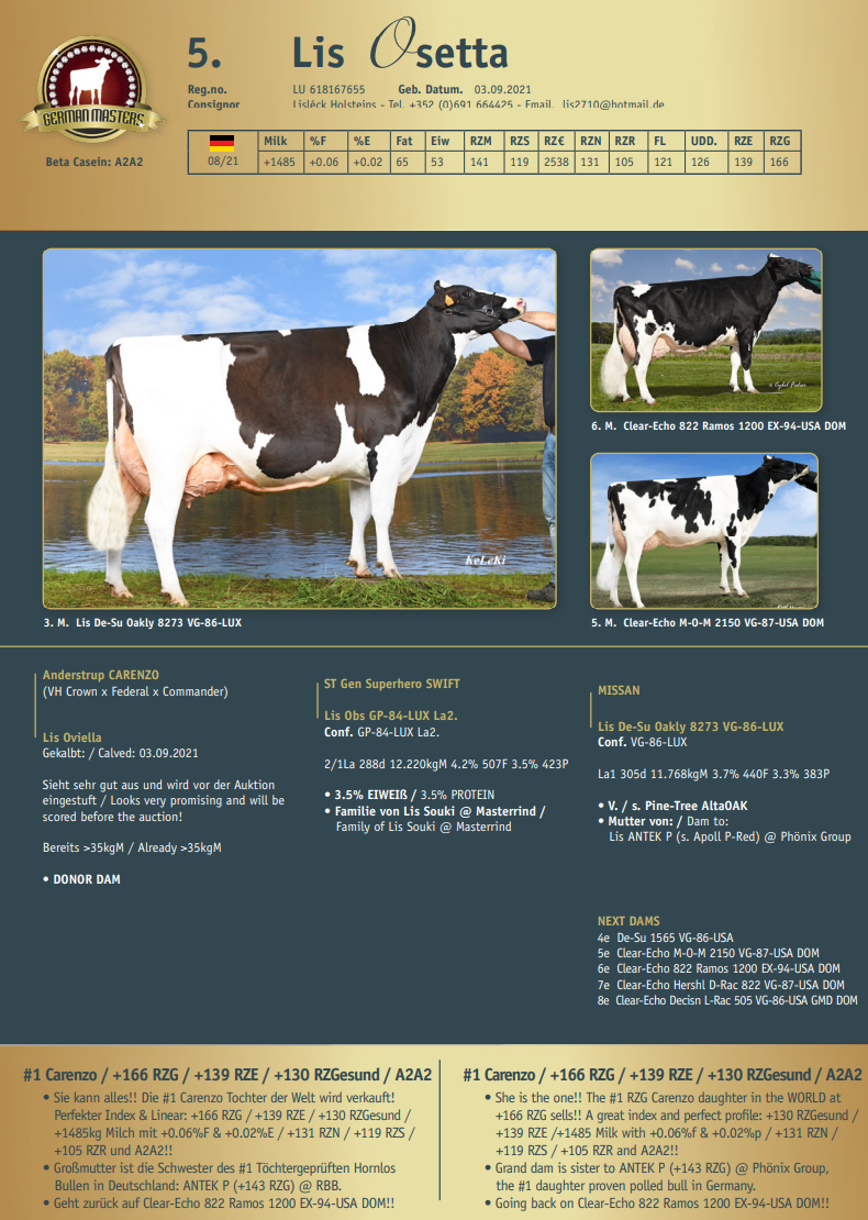 Just only 35 days FRESH and already incredible: Lis Oviella! Lis Oviella scored VG-85-LUX 2yr. and is pictured by Guillaume Moy together with her CARENZO daughter, Lis Osetta last week. Lis Osetta will be for sale in the German Masters Sale as absentee lot. Lis Osetta is the #1 Carenzo daughter with +166 RZG / +139 RZE / +130 RZGesund and A2A2. Osetta her dam Oviella, is a Swift daughter out of Lis Obs GP-84-LUX (s. Missan) followed by Lis De-Su Oakly 8273 VG-86-LUX. Oakly is the dam to Lis Antek P (s. Appol P-Red) @ Phönix. Lis Osetta is going back on Clear-Echo 822 Ramos 1200 EX-94-USA DOM.