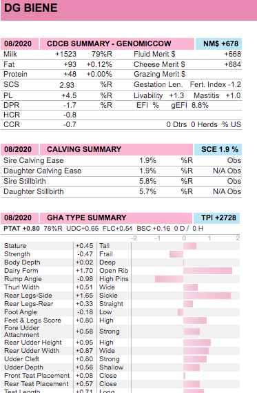 If you would take the progress made in the recent years in the Black and White population because of bulls such as Superstition, Supersire and Delta it is behond imagniation. Not one breeding programm in the world does not want these bulls in their programm, every sire line up in the world is having some of these genes running trough multiple bulls in their line up, often some of the very best. Trough the excellent 91 scored Delta daughter these valuable genetics are now coming available for the Red & white population. Her daughter DG Biene is now continuing this line with maybe the most suprising black and white bulls from the last two index runs Burley. Als DG Biene is a Red carrier and trough her the valuable Burley genes will also come available fort h world wide Red & White population. She has valuable pregnancies incluing the breed leader Captain, this to also secure this top Black and White bull for future the Red & White genetics.