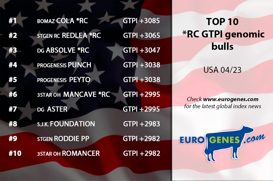 Last tuesday came the new US-index ONLINE available at Eurogenes. Leader in the Top *RC GTPI index is Bomaz Cola *RC at +3085 GTPI in combination with +1.82 PTAT and +2.26 UDC! He is followed by the former #1 *RC GTPI sire Stgen RC Redlea *RC at +3065 GTPI. Making the Top 3 complete with newcomer DG Absolve *RC at +3047 GTPI. He is a Captain son out of Trent-Way-JS Ronald daughter DG OH Audrey. He shows a balanced profile with +3047 GTPI in combination with +1.58 PTAT and +985 NM$. Also his milkproduction traits, health traits and type traits are worth mentioning, he has +1554kgM with +0.13% Fat and +0.04% Protein, +1.4 DPR, 2.86 SCS, +0.09 Mastitis, 1.7% Sire Calving Ease, Sloped and Wide Rumps and +1.14 FLC. Furthermore at the 8th spot we find S.J.K Foundation *RC at +2983 GTPI. He is a Captain son out of Avance-Red daughter Primeval 5121. She is also dam to S.J.K. Pele-Red (s. Star P) at +2850 GTPI.