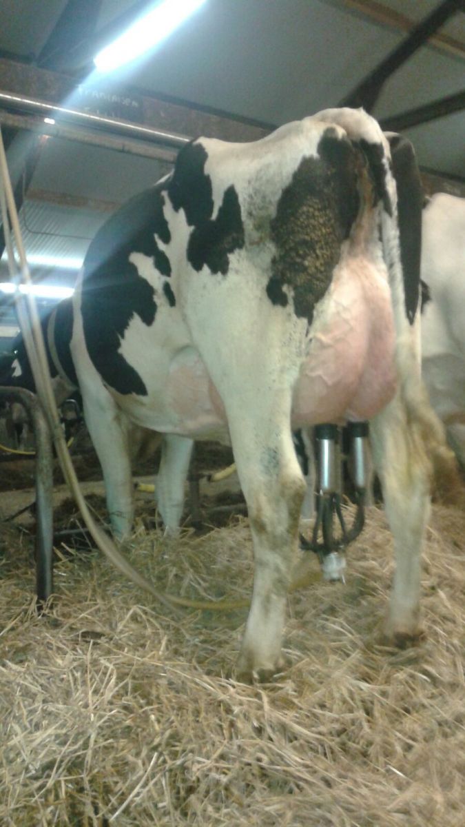 One of the greatest 2yr. olds ever calved in the barn of Vliek Holsteins: DG Christa! Vliek Holsteins purchased her in the Vekis Spring Sale '14 and goes back through a very nice alternative line on the Larcrest Cosmopolitan cow family. Her interesting sire stack: Galaxy x VG-87 2yr. Beacon x VG-86 2yr. Ramos x Larcrest Oside Champagne EX-90-USA! Christa is a full sister to Gandhi at the Vost and Gustavo at the RBB, both Top 10 RZG Galaxy sons in Germany. Click further for some barn snapshots of DG Christa.