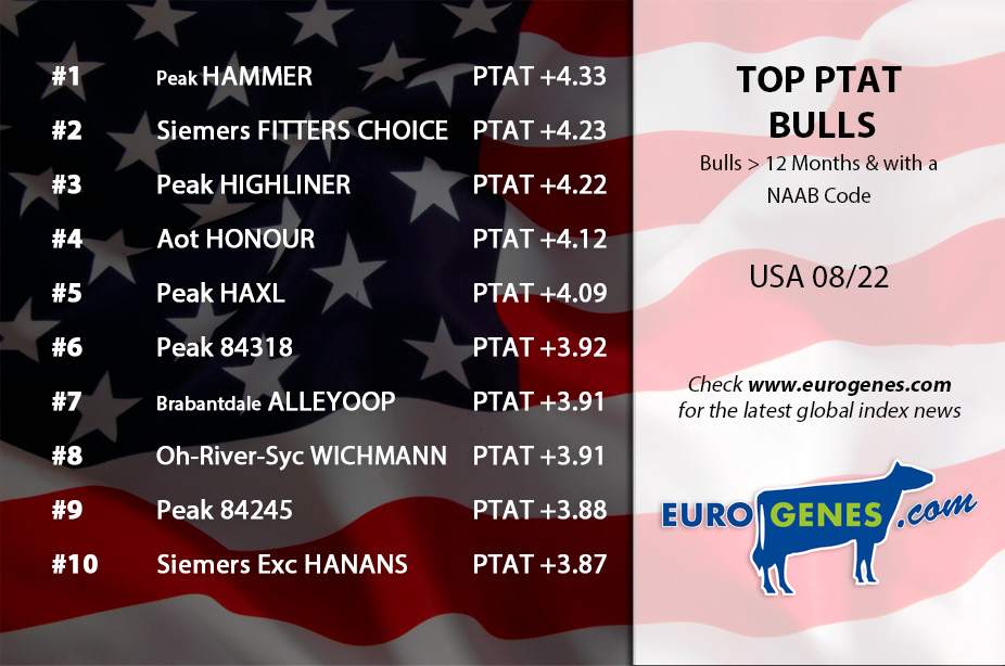 The new indexes from the USA came in! A solide August 2022 proof for Mr. T-Spruce Frazz Lionel, he is again the #1 GTPI International Daughter Proven sire at +3190 GTPI with +1274 NM$. In second follows De-Su Frazz Tahiti at +3036 GTPI and at the third spot we find Denovo 2703 Venture at +2984 GTPI. In the PTAT list are not huge chances this index run. The #1 PTAT bull is again Peak Hammer at +4.33 PTAT, he combines this extraordinary PTAT score with +2527 GTPI. Followed by Siemers Fitters Choice (+4.23 PTAT) and Peak Highliner-ET (+4.22 PTAT). In the top RED CARRIER GTPI sire list we find a red carrier Captain son: Redlea at +2978 GTPI in combination with +2.03 PTAT followed by Koepon Zaz at +2937 GTPI and making the Top 3 complete with Winstar Kessel at +2920 GTPI.