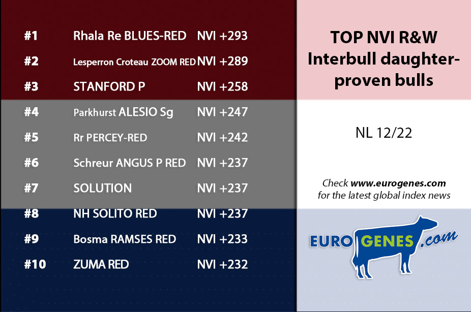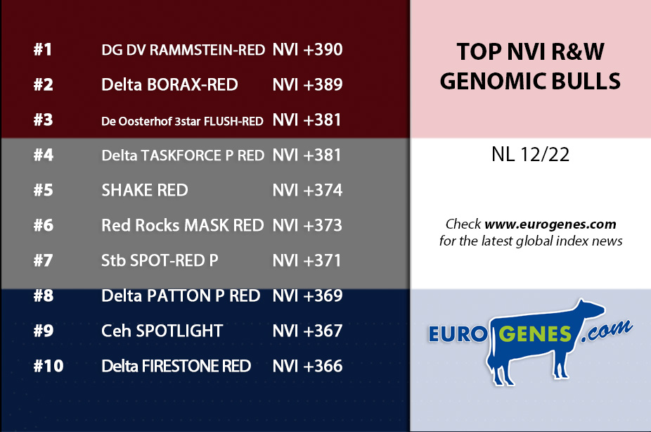 DG DV Rammstein-Red takes the lead in the Dutch Genomic Rankings at +390 gNVI. Jayvano *RC son Rammstein-Red traces back to the Golden-Oaks Mark Prudence EX-95-USA cowfamily with as 3rd dam De Oosterhof DG Rose *RC VG-89-NL EX-MS. Rammstein-Red scores in his Dutch index +2759kgM with +0,05% Protein and +108 Type! The new leader in the R&W Daughter proven Interbull ranking this proof is Rhala Re Blues Red @Ai-Total at +293 gNVI! The Salvatore *RC son is the new #1 R&W gNVI sire with 23 daughters in his index and +3096kgM. He is followed by Lesperron Croteau Unix Zoom Red at +289 gNVI and making the Top 3 complete with another Salvatore *RC son Stanford P at +258 gNVI. Furthermore at the 9th spot we find Bosma Ramses Red at +233 gNVI, he is a Mission P son and has 66 daughters in his index.