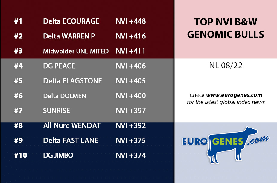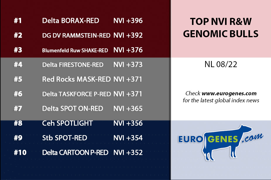 We continue the August proof with the Dutch indexes coming in. The #1 Genomics B&W GNVI sire is Delta Encourage, a Fragant son with +448 NVI, followed by Delta Warren P at +416 NVI and on the third place Midwolder Unlimited at +411 NVI. Furthermore we find in the Top 10 B&W genomics GNVI sires the maternal brothers DG Peace (s. Captain) @Ai-Total at the 4th spot at +406 NVI and DG Jimbo (s. Arrozo) @Ai-Total at the 10th spot at +374 NVI. DG Peace and DG Jimbo their dam is Redrock Klutch daughter Paeẞens Jezebel VG-86-NL 2yr. The #1 R&W genomic sire is Delta Borax-Red at +396 NVI, followed by DV DG Rammstein-Red (+392 NVI) and Shake-Red (+376 NVI). The #1 daughter proven Black & White interbull sire is this run OH DG Topstone (s. Topshot) at +300 NVI.