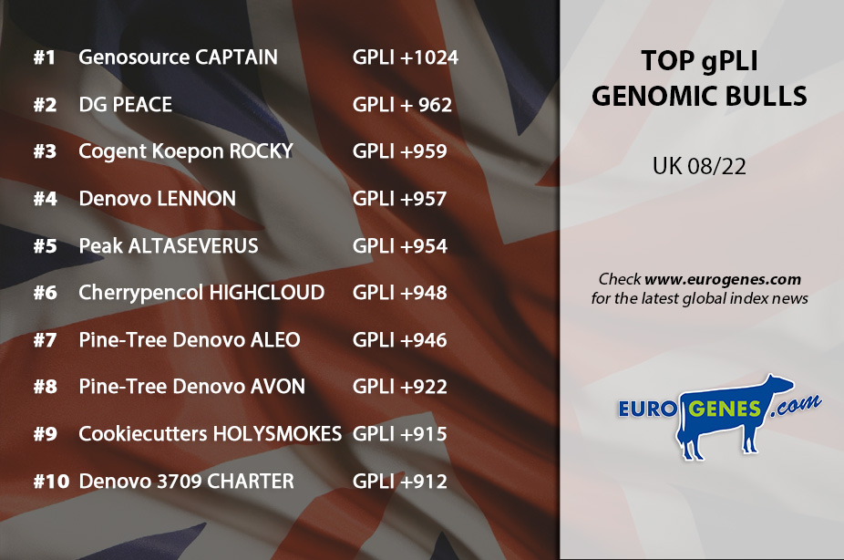 For the fifth time shows Genosource Captain again his strength in the United Kingdom! He is again the #1 LPI genomic bull at +1014 PLI in combination with +1.04 TM. DG Peace debuting as the #2 PLI bull in this ranking with +962 PLI. He is an Captain son out of Peaẞens Jezebel! Making the Top 3 complete with Koepon Rocky at +959 PLI. The #1 TYPE MERIT genomic bull in the UK is Nashville at +2.88 TM, followed by Roman *RC at +2.86 TM and on the third place Rimrock *RC at +2.72 TM. Furthermore, on the fifth spot we find R&W bull Nosbisch Holsteins SOLITO-RED at +2.66 TM.