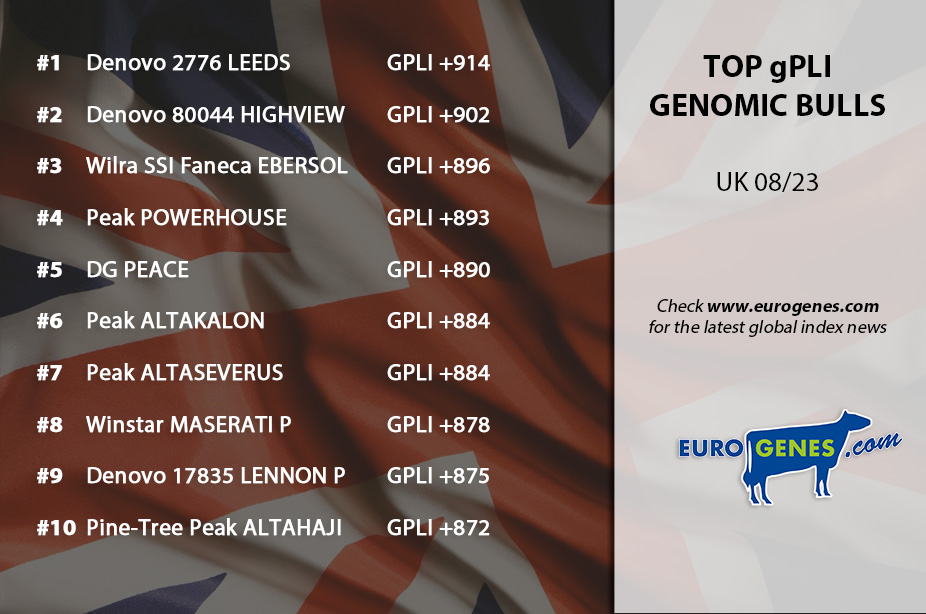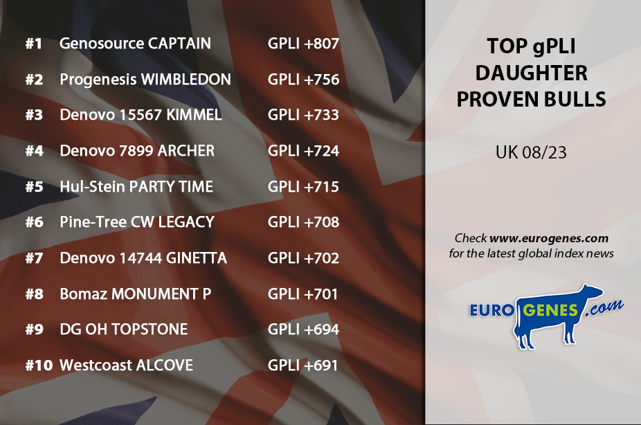 Genosource Captain came in as the #1 gPLI daughter proven sire this August 2023 run at +807 gPLI in combination with +1.65 TM (Type). He is followed by the Progenesis Wimbledon at +756 PLI and at the third spot we find Kimmel at +733 gPLI. Furthermore at the 9th spot we find the Topshot son from the Golden-Oaks Mark Prudence EX-95-USA family DG OH Topstone at +694 gPLI in combination with +1.68 TM, what makes him the highest Type Merit sire in this top 10 with daughterproven PLI sires. Topping in the gPLI genomics sire index is Denovo Leeds at +914 gPLI. He is followed by Denovo Highview at +902 PLI and making the top 3 complete with Wilra SSI Faneca Ebersol at +896 PLI! At the 5th spot we find Captain son DG Peace @ AI-Total at +890 PLI out of Peassens Jezebel VG-86-NL 2yr. Furthermore we find DG Space (s. Captain) at spot 21 at +846 PLI in combination with +1.16 TM.