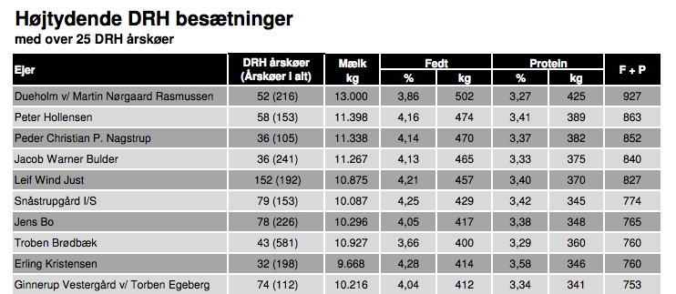 Dueholm Breeding I/S from Denmark is the highest R&W production herd in Denmark from last year. 52 out of the 216 milking cows in the Dueholm herd are R&W, these 52 Red cows averaged 13.000 kg milk with 927 kg Fat + Protein! A great achievement for the Red cows from Dueholm Breeding, a result of the great management in combinatoin with the high genetic level, which includes members of the Pietje, Mariegold, Splendor, Kylie, Gabi and other families.