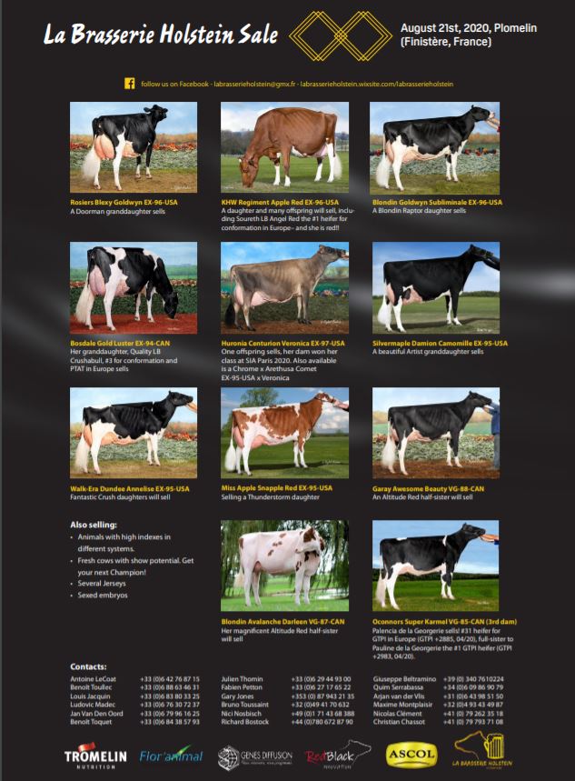 A new flyer of the early consignments for the La Brasserie Holstein Sale taking place August 21 in Plomelin, France. Selling are a Doorman granddaughter of the Grand Champion World Dairy Expo 2017: Rossiers Blexy Goldwyn EX-96-USA, a directly daughter of the 'one million dollar cow' KHW Regiment Apple-Red EX-96-USA, a Blondin Raptor (not available in Europe) daughter of Blondin Goldwyn Subliminale EX-96-USA, a Chrome granddaughter of the LEGEND Huronia Centurion Veronica EX-97-USA, an Altitude-Red (either not available in Europe) sister to Blondin Avalanche Darleen-Red VG-87-CAN 2yr. - 2nd Milking Yearling World Dairy Expo 2019 & multiple high index heifers, show cows, FEMALE embryos and more! Go to website of La Brasserie Holstein for more info or visit their page @ Facebook.