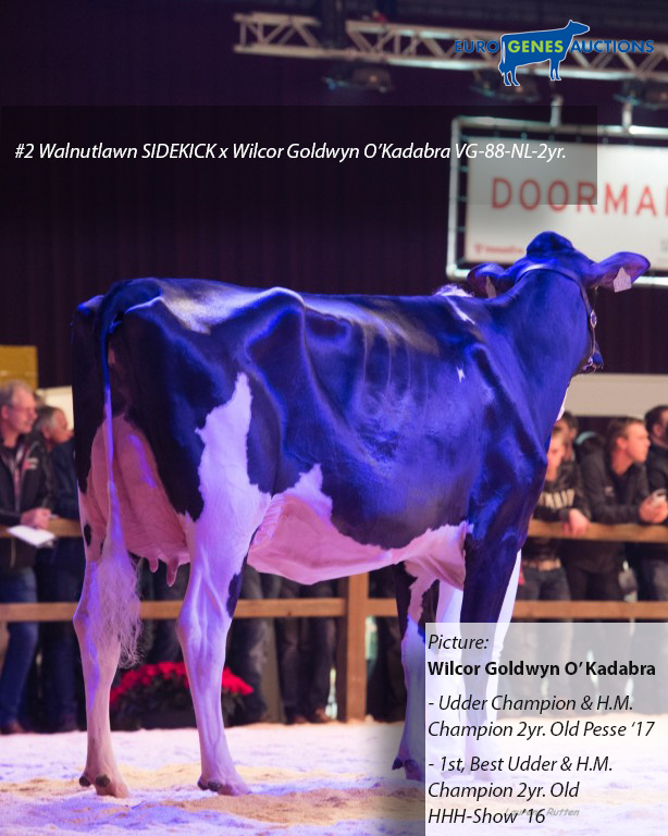 In the currently Online Embryo Sale are early Walnutlawn Sidekick embryos selling of Wilcor Goldwin O'Kadabra VG-88-NL 2yr. Kadabra was Best Udder & H.M Champion 2yr. Old @ National HHH-Show '16 and H.M. Champion 2yr. Old @ Wintershow Pesse '17. She is a grand daughter of the one and only O'KALIBRA EX-97 which won multiple titles like: the Swiss Expo, European Show in Fribourg and became World Champion. Click further for more info.