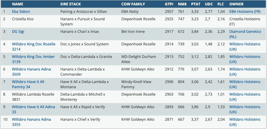 Today we'll introduce you the top GTPI females above >+2600 GTPI and >+3.00 PTAT (type) in Europe bases on the index proof. Topping at +2957 GTPI in combination with +3.33 PTAT is again Pairing daughter EBA Sidoni backed by EBA Netty VG-87-FR 2yr. Netty is the dam to EBA Davinci @AI-Total. At the second spot we find an Italian Hanans daughter: Cristella Kiss at +2925 GTPI and +3.23 PTAT from the Diepenhoek Rozelle family. Making the Top 3 complete with DG Sigi. She is a Hanans daughter tracing back to the Bel Iron Irene EX-90-IT cow family. She is the #3 female in this ranking at +2917 GTPI and +3.84 PTAT. Willsbro Holsteins appears frequently in this top 10 with many daughters sired by King Doc, Hanans, Have it All and Delta-Lambda daughters!