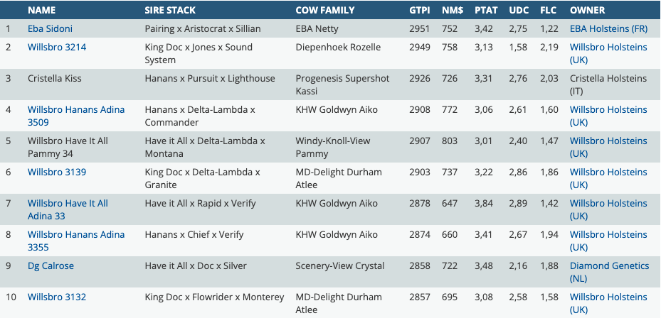 Today we'll introduce you the top GTPI females above >+2600 GTPI and >+3.00 PTAT (type) in Europe bases on the index proof. Topping at +2951 GTPI in combination with +3.42 PTAT is Pairing daughter EBA Sidoni backed by EBA Netty VG-87-FR 2yr. Netty is the dam to EBA Davinci @AI Total. In second follows King Doc daughter Willsbro 3214 she is going back on broodcow Diepenhoek Rozelle. Willsbro 3214 combines +2949 GTPI with +3.13 PTAT! On the third spot we find a Hanans daughter from Italy with +2926 GTPI with +3.31 PTAT. Furthermore, we find a lot of Willsbro Heifers in the Top 10 of this list, with Willsbro Hanans Adina 3509 on the fourth spot. She is also a Hanans daughter from the KHW Goldwyn Aiko family with +2908 GTPI and +3.06 PTAT. The #15 PTAT Calf (<9 Months) during the April 2022 index proof ranks #7 in this list with +2878 GTPI and +3.84 PTAT!