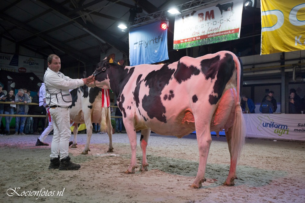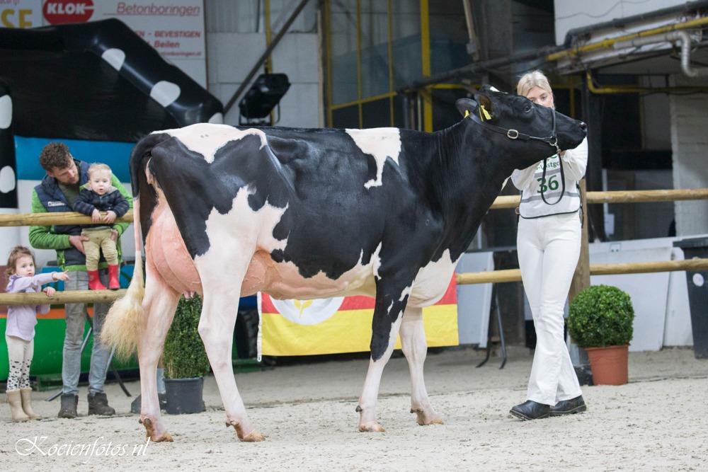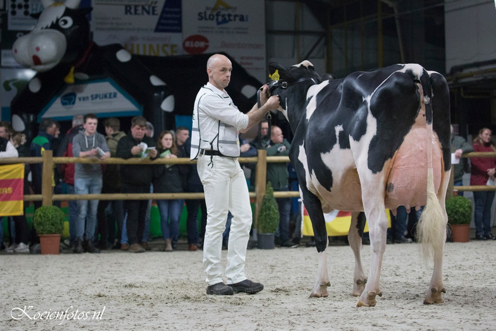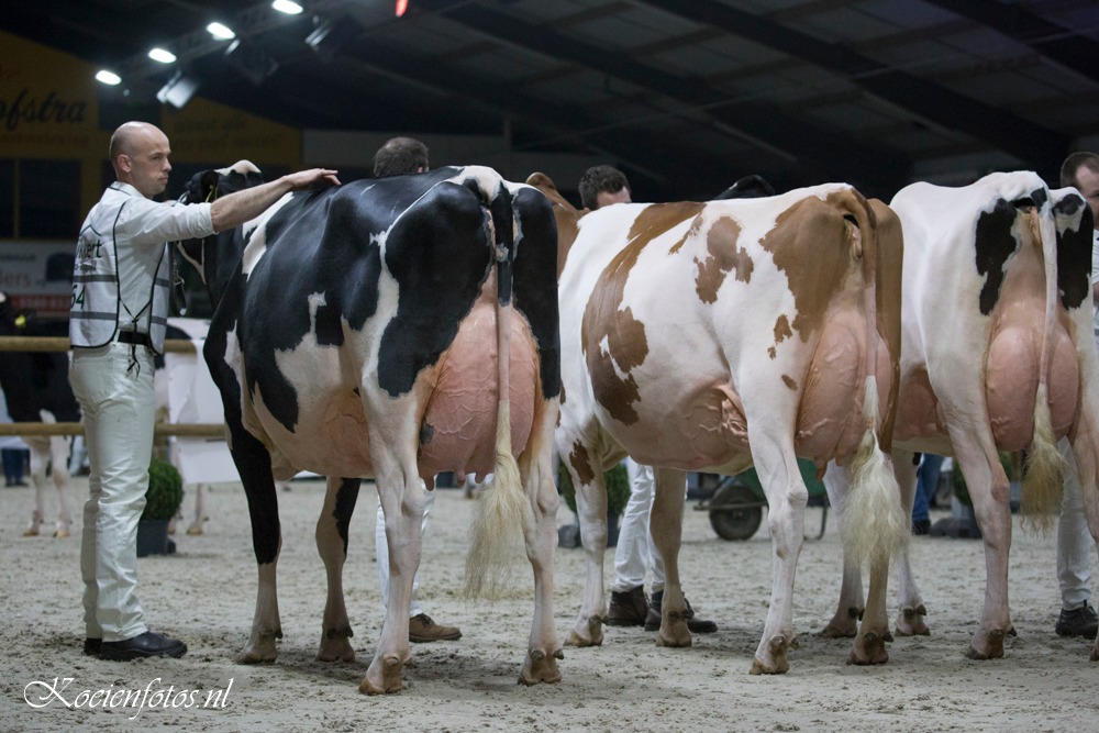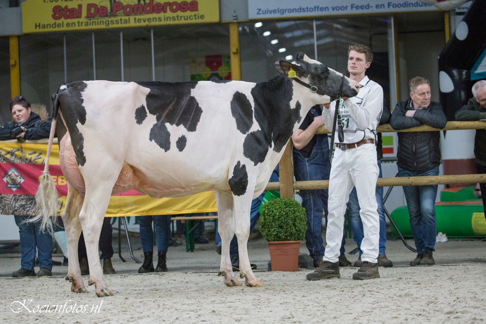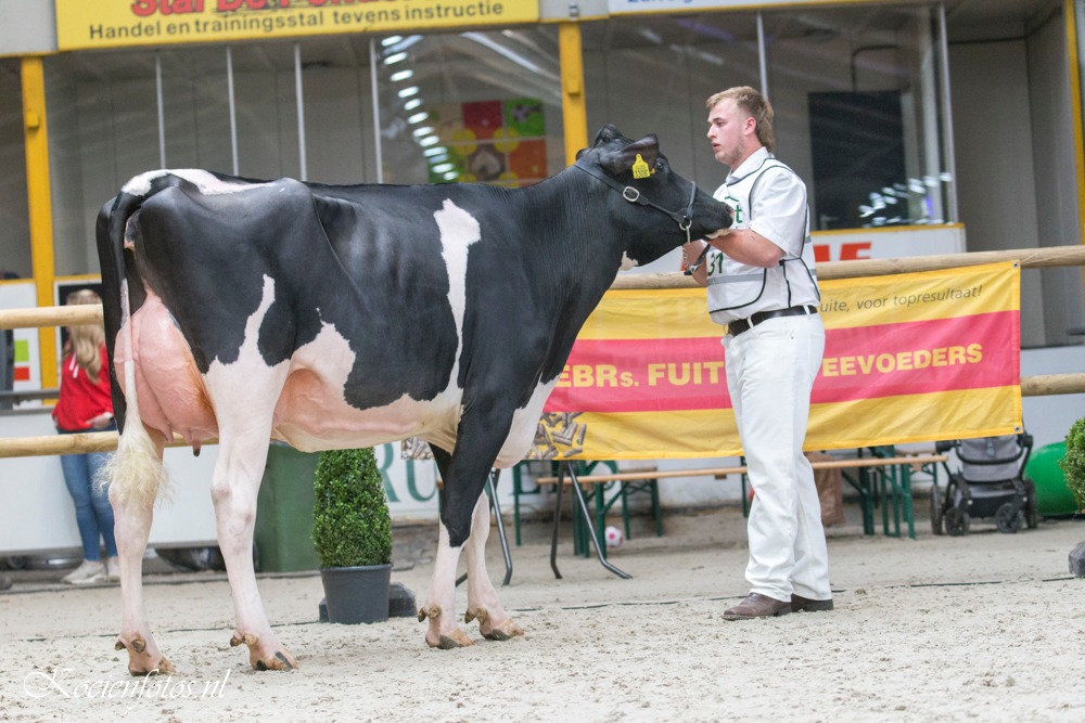 The FDV Wintershow was held in Beilen, Drenthe last weekend. Eurogenes members Veenstra Holsteins & Giessen Holsteins had a great show. The Reserve Senior Champion title went to Mogul daughter Veenstra Cinderella 1. The 6 weeks fresh Mogul daughter of Veenstra Holsteins won 2 weeks earlier the Grand Champion title at the Wintershow in Groningen. Cinderella 1 her dam is Palermo daughter Molenkamp Eva from Shottle daughter De Rith Cinderella 23 EX-90-NL x Giessen Cinderella 17 EX-90-NL and goes through Wilcoxview Cinderella EX-92-USA back on C Glenridge Citation Roxy EX-97-USA. Veenstra Holsteins took also home the Reserve Intermediate Champion with Delta-Lambda daughter Sanne 43.