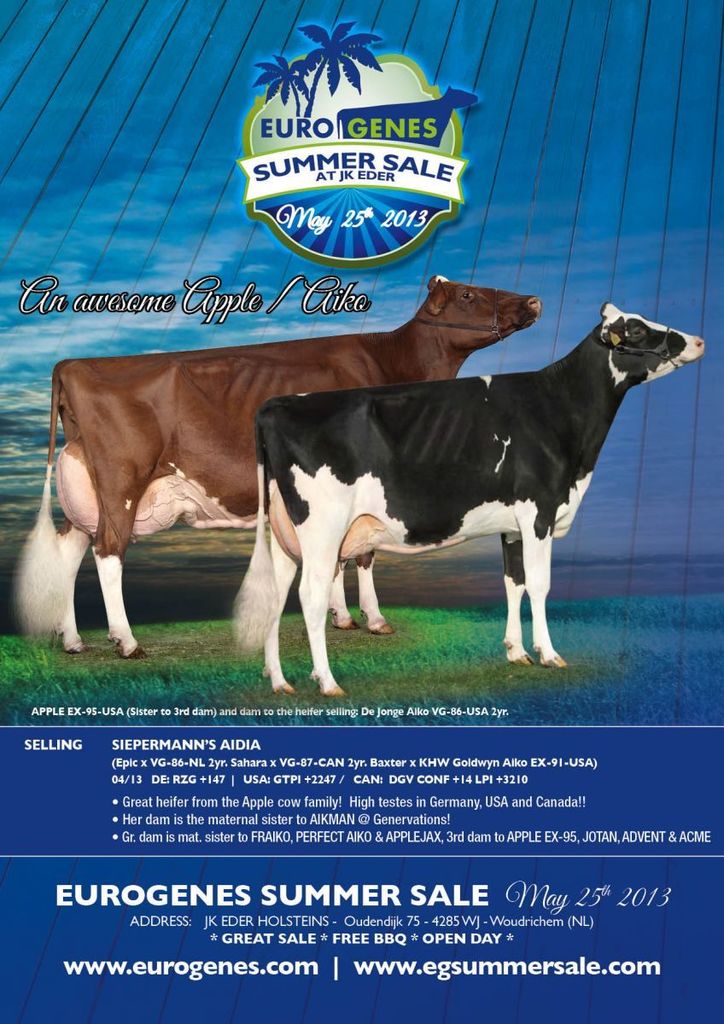 Siepermann Aidia SELLS! A lovely heifer from the family of the R&W Grand Champion of Madison, KWH Regiment Apple Red EX-95-USA! And the family of AIKMAN (mat. brother to her mother), Fraiko, Perfect Aiko, Applejax, Advent, Jotan, Acme and more! This lot has a high test in   DE: RZG +147  |   USA: GTPI +2247 /   CAN:  DGV CONF +14 LPI +3210!!