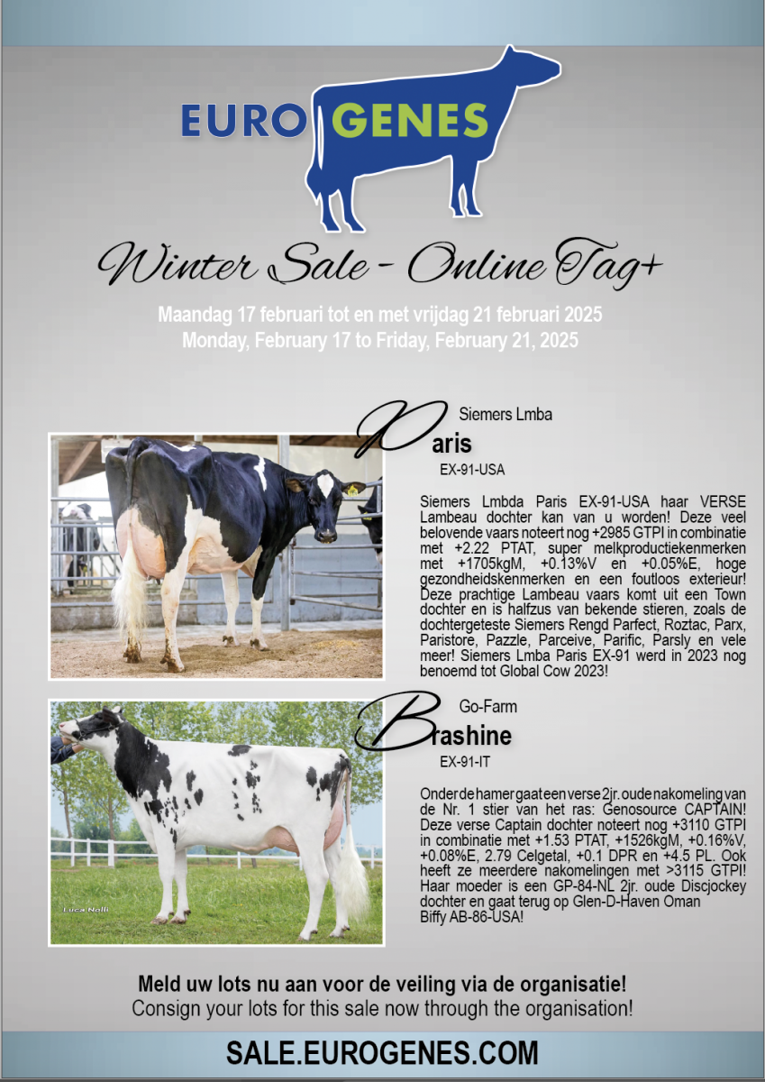 The countdown to the Eurogenes Winter Sale - Online Tag+ 2025 has been started! The Eurogenes Winter Sale - Online Tag+ 2025 will start on Monday the 17th of February at 11.00 a.m. (Dutch Time) and ends at Friday the 21th of February at 08.00 p.m. (Dutch Time) through the sale site. Selling are >20 lots with something for everybody. Fresh 2yr. olds, high genomics, fantastic show heifers and much more. For more info please contact us through info@eurogenes.nl.