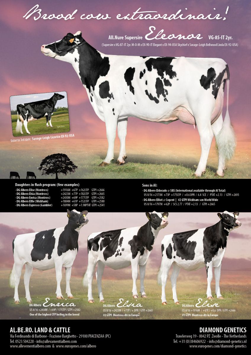 All.Nure Supersire Eleonor of Diamond Genetics and Al-Be-Ro Holsteins from Italy has developed herself is one of the most impressing European brood cows of her time. Eleonor recently scored VG-85 in Italy in her 1st lactation and has many sons in daughters in the top of the international index rankings, like her sons Eldorado @ AI Total and Elliot @ Cogent and her daughters DG Albero Elise & Elsia which are the #1 and #2 GTPI Montross daughters in Europe. Click further for the most recent advert of Eleonor.