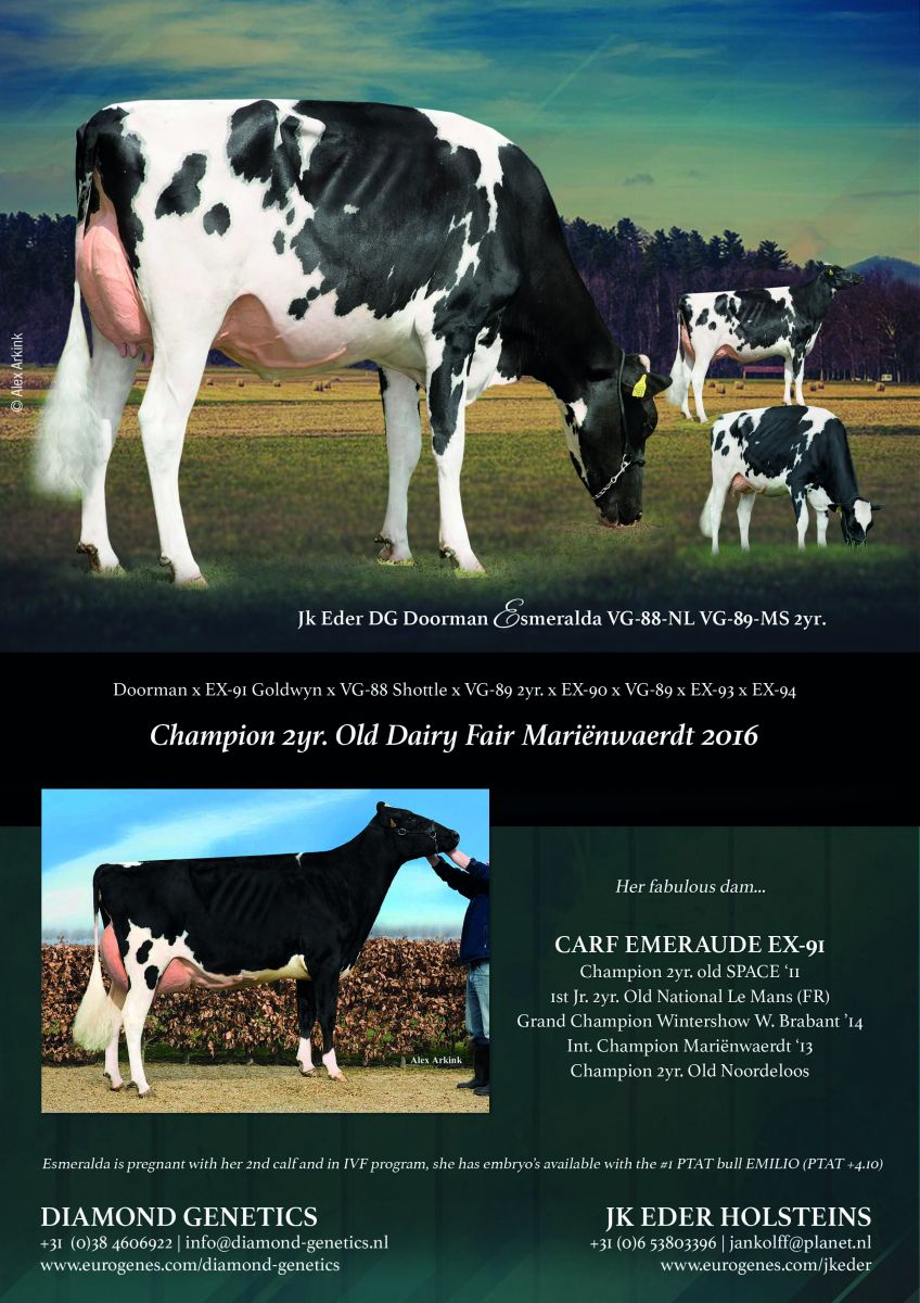 Carf Emeraude is going from Strength to Strength. From the great cow family of the French cow of the year Amaranthe, Carf Emeraude has a huge show victory list which includes the French National Championship as a 2yr. old and now she is doing the best as a brood cow. She has multiple incredible daughters around the World, like her VG-88 2yr. Doorman dtr JK Eder DG Esmeralda which was Champion 2yr. old Mariënwaerdt and Res. Champion at Hoornaar! Carf Emeraude is almost 8 years old now and looks like a queen!! Watch for her pictures taken last week!