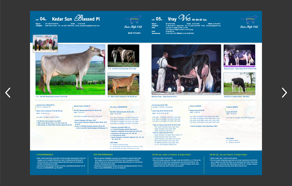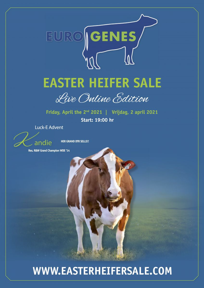 An ONLINE LIVE SALE which you would'nt miss! The first LIVE edition of the Eurogenes EASTER Heifer Sale. The Eurogenes EASTER Heifer Sale will be held live on Friday the 2nd of April at 19:00 (Dutch-time) through the sale site. Videos and snapshots of the lots selling will be available in the week before the sale. Selling are >39 lots with something for everybody. High genomics, fantastic show heifers, Brown Swiss's, Jersey's, Red & White's, embryo packages and much more. For more info please contact us through info@eurogenes.com. Click further for the catalogue.