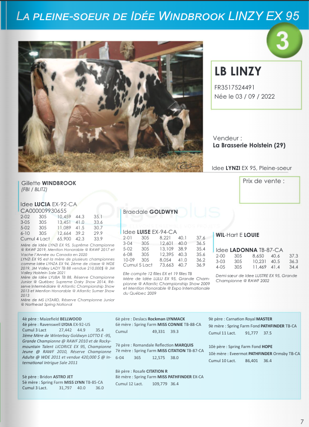 - Full sister to the Grand Champion Royal Winter Fair 2019: Idee Windbrook Lynzi EX-95-CAN