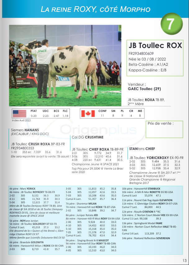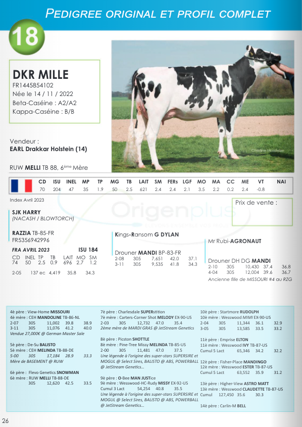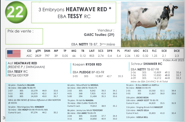 The Vente Orne 2023 will be held on Wednesday the 7th of June. Several Eurogenes members from France will offer their best genetics in this sale like, Lot 3. She is a Windbrook daughter, owned by La Brasserie Holstein, out of Idee Lucia EX-92-CAN, which makes her the full sister to the Grand Champion Royal Winter Fair 2019, Honorable Mention Grand Champion Royal Winter Fair 2017 and more: Idee Windbrook Lynzi EX-95-CAN EX-95-MS 4E. Or a +3.20 PTAT / +11 Conformation Hanans grand daughter to the 2yr. old Champion SPACE 2021 and Topseller La Brasserie Sale 2020: JB Toullec Chief Roxy VG-89-FR. Drakkar Holsteins sells as Lot 18. DKR Mille, she is a SJK Harry daughter from the Wesswood-HC Rudy Missy EX-92-USA cow family at +204 ISU!