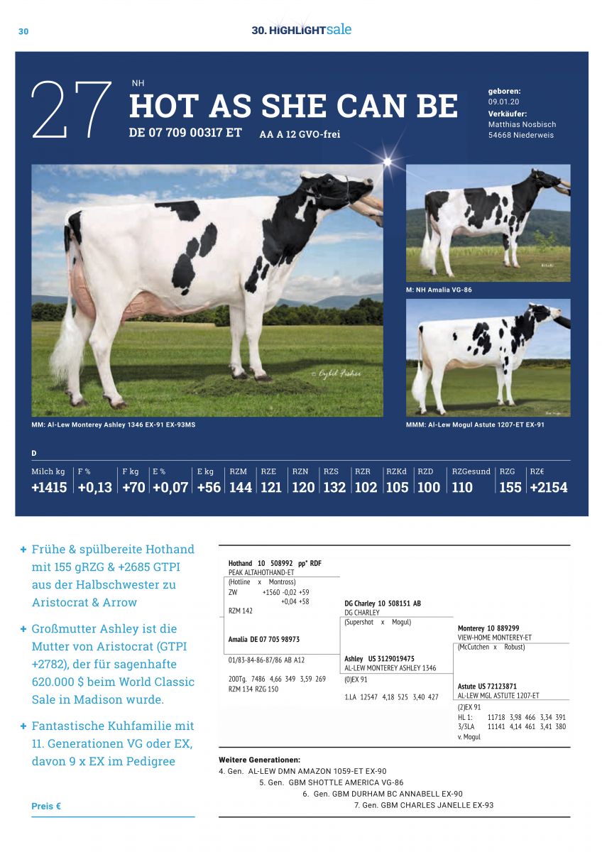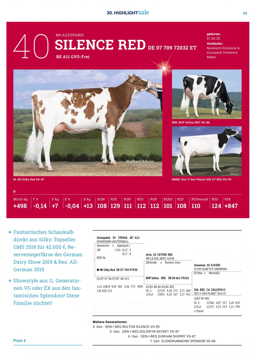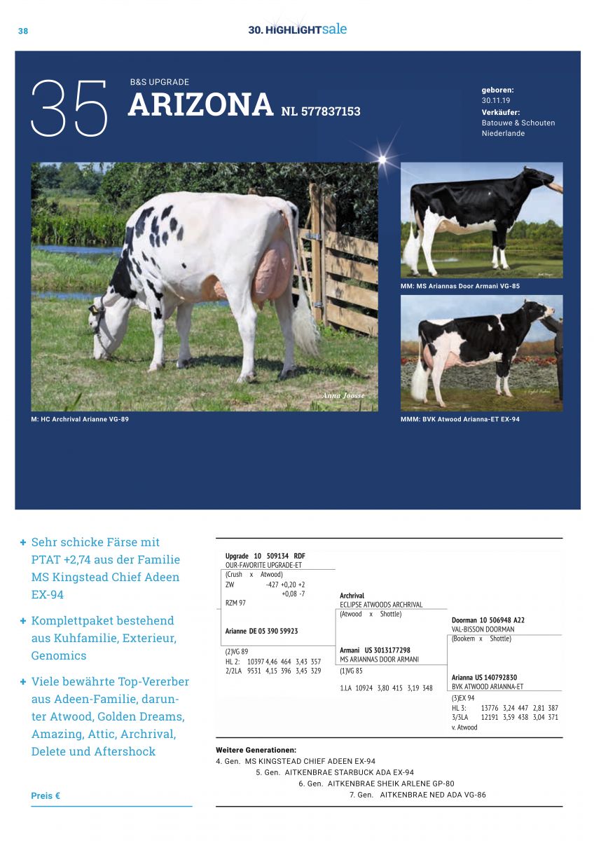 Tomorrow the ONLINE edition of the 30. HighlightSale will start through the webstie Live-sales.com. Several Eurogenes members have consigned their very best for this Online Sale which closes on lot order Friday the 8th of Januar at 8:00 P.M. (German time), when the final starts. Nosbisch Holsteins offers a fancy & ready to flush AltaHothand from Mr Frazzled ARISTOCRAT'S VG-86-DE La1. maternal sister by Charley and a lovely R&W Unstopabull-Red straight out the Res. 2-Yr Old Champion German Dairy Show 2019, Res. All-German '19 and second topseller German Masters Sale '19 for 42.000 EUR: NH DG Arvis Silky-Red VG-87-DE 2yr. Batouwe Holsteins sells a +2.74 PTAT Upgrade daughter of the former #1 PTAT Cow in Europa: HC Archrival Arianne VG-89-NL EX-91-MS (MAX) backed by MS Kingstead Chief Adeen EX-94-USA.